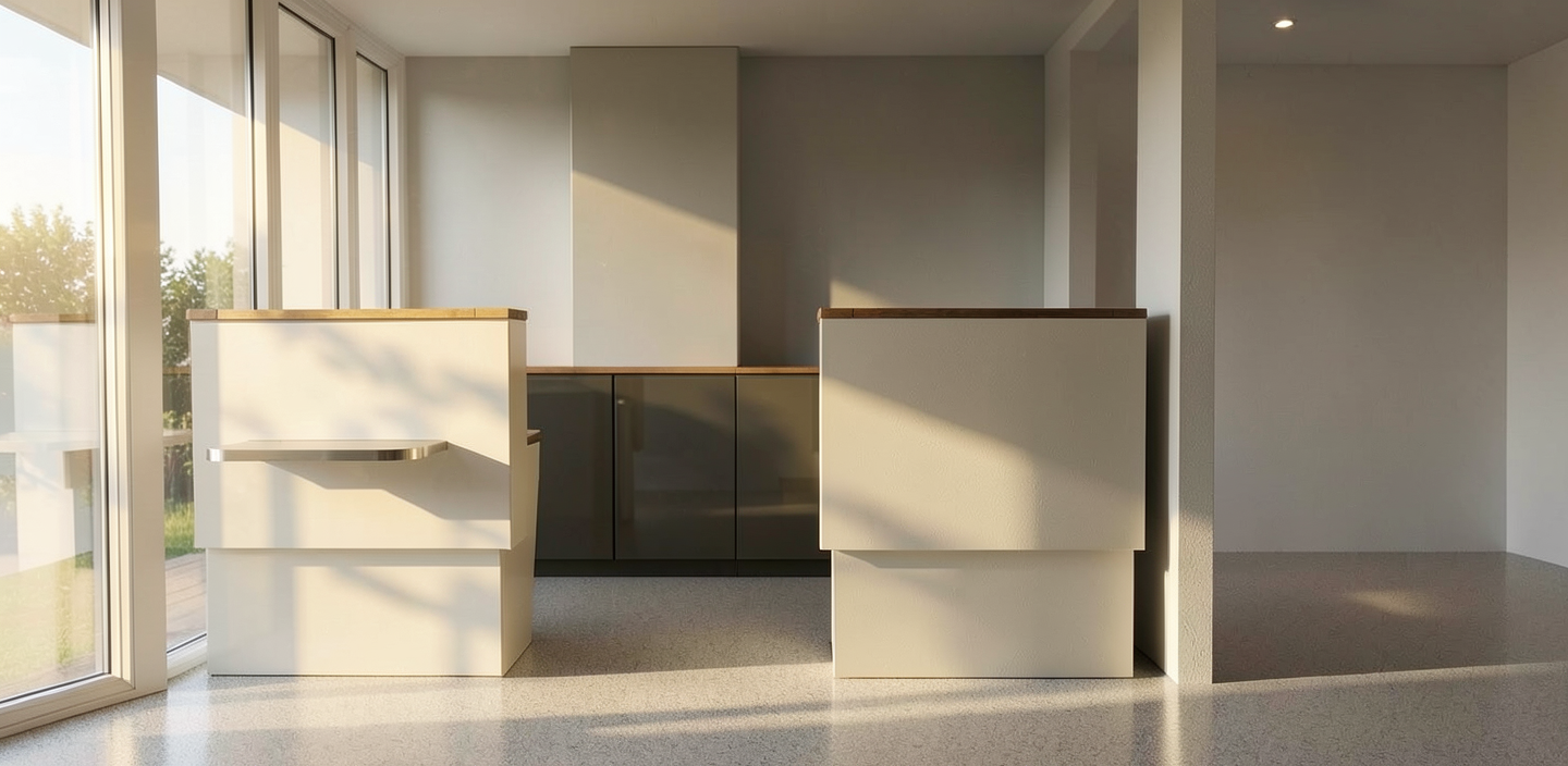 render a modern minimalist bedroom with a warm bright cozy aesthetic the walls are light beige creating a calming atmosphere the bed is a deep brown color with colourful bedding offering a contrast against the walls the floor is oak harmonizing the whole room a small desk is adjacent to the bed in oak with a modern minimalistic chair and a computer screen on it large glass doors are across from the bed the overall ambiance is serene and modern