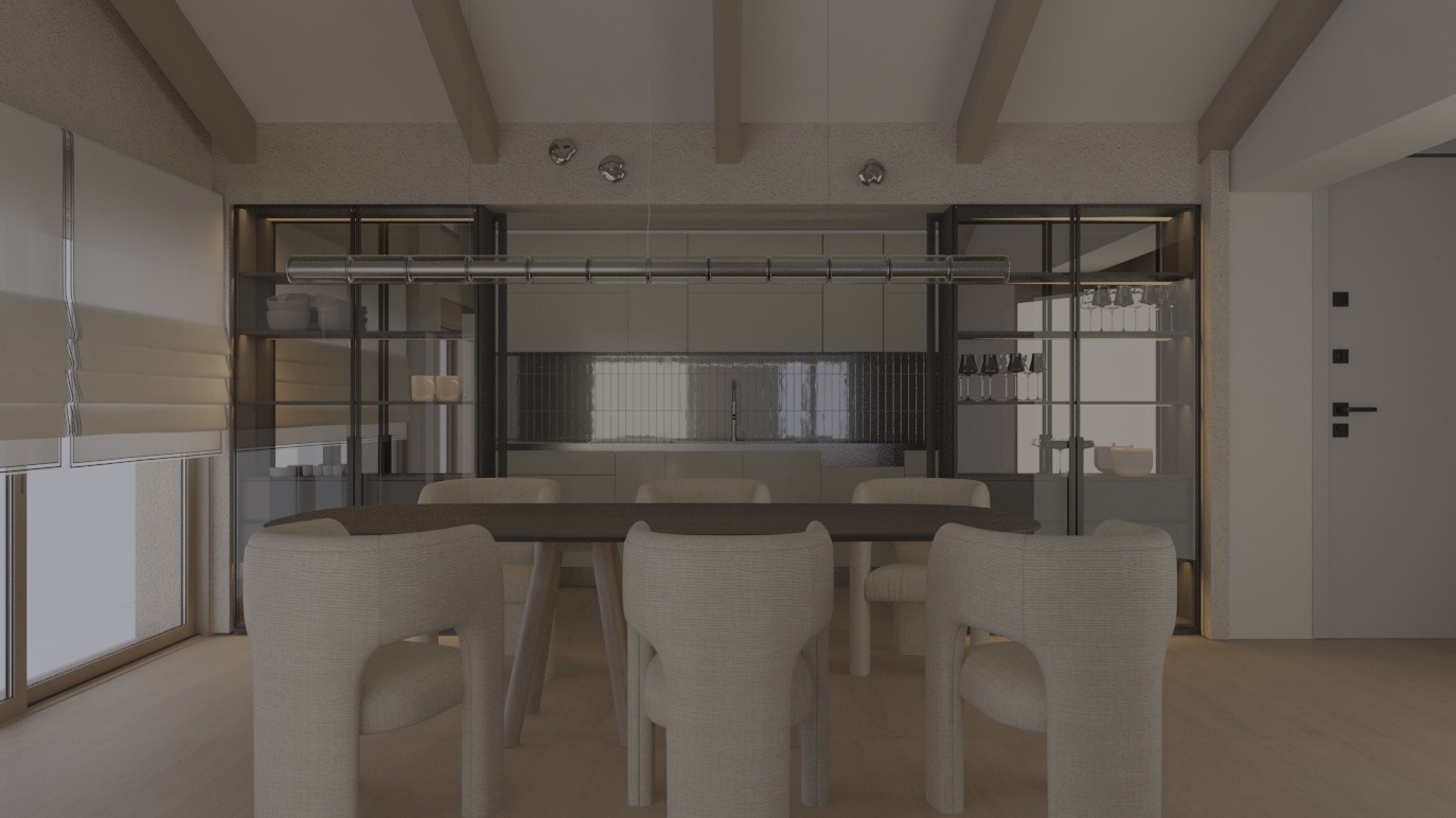 ultra realistic interior architectural visualization of a modern dining room enhance lighting and realism soft natural daylight coming from the left window balanced exposure cinematic contrast warm highlights and slightly cool shadows subtle bloom on artificial lights detailed fabric texture on chairs rich wood grain on table realistic reflections on glass shelving soft ambient occlusion depth atmosphere slightly darkened background for depth clean scandinavian minimal style sharp but natural details global illumination feel photorealistic 35mm lens high dynamic range soft vignette subtle film grain do not remodel not zoom not crop