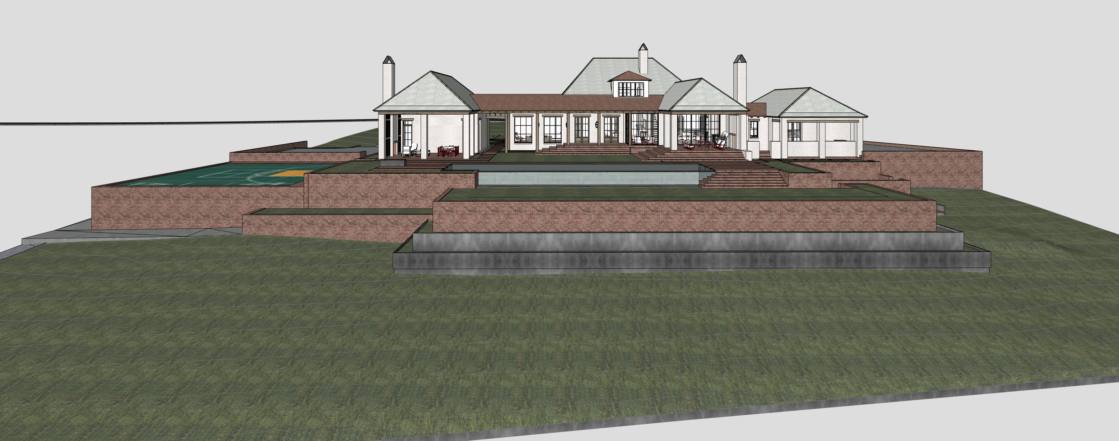 white lime washed brick waters edge and manicured grass in the foreground slate roof trees in the background to the right