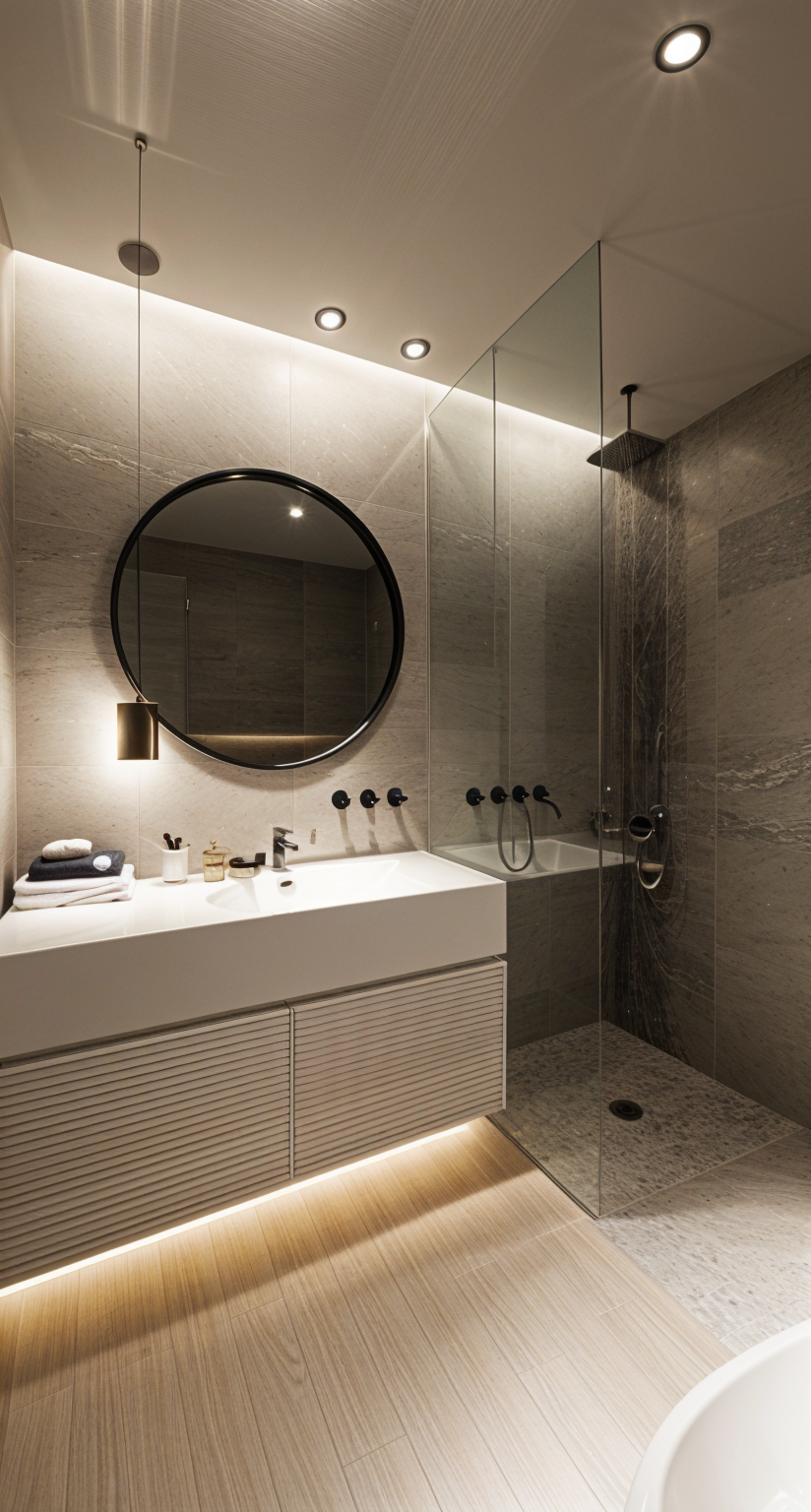 render a modern bathroom with a minimalist design the walls are textured in warm grey granite tones giving a soothing and natural look the ceiling features a plasterboard white in a mat finish reflecting soft light include a frameless circular mirror above the sink which is sleek and white with clean lines a pendant light hangs beside the mirror emitting a warm soft glow the floor is light wooden the shower has a glass partition with frameless the overall atmosphere is tranquil and elegant with soft ambient lighting highlighting the textures and shapes the bathroom furniture is white the height of the furniture is half of the one we see in the image the bathroom faucets are black glossy and the sink faucets are wall mounted the sink is white corrian mat material remove the carpet the floor in woodden tiles remove the sink inside the shower the faucets are black glossy remove the frame from the mirror lighting soft ambient underneeth the mirror make the drawers underneeth the sink shorter half the size the furniture