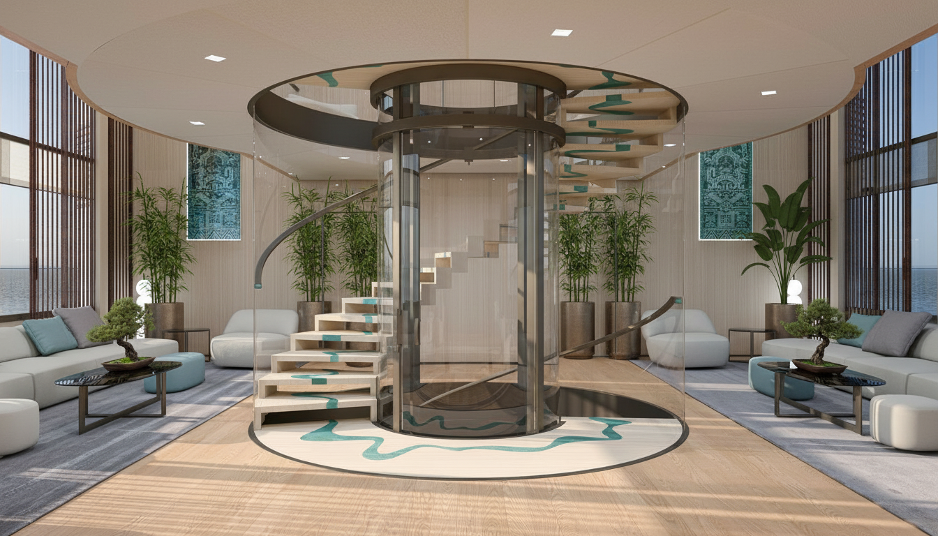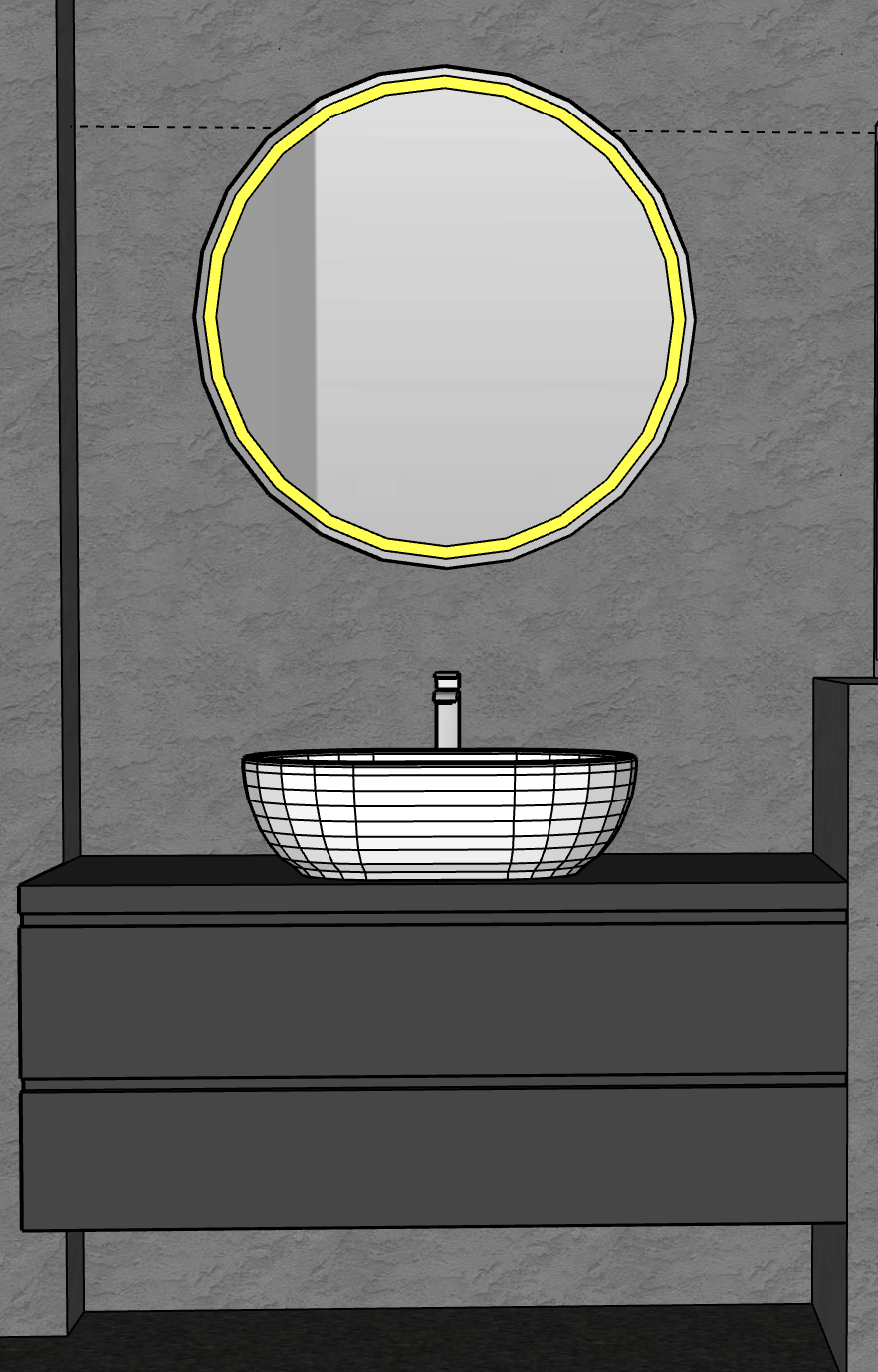 photorealistic interior design render of a luxury modern bathroom vanity front view the centerpiece is a circular wall mirror with a diameter of 800 mm the mirror features a specific integrated led light ring on the face the illuminated strip is 20 mm wide and starts exactly 15 mm inward from the outer edge of the glass creating a delicate non illuminated glass border the background creates a dramatic contrast with a white marble wall featuring bold dark grey veining below the mirror is a floating vanity cabinet with a dark walnut wood front and an open storage shelf in the middle containing folded white towels and a woven basket a sleek white rectangular vessel sink sits on the white countertop the scene is flanked by two large potted green plants on tall black stands soft neutral lighting 8k resolution architectural visualization