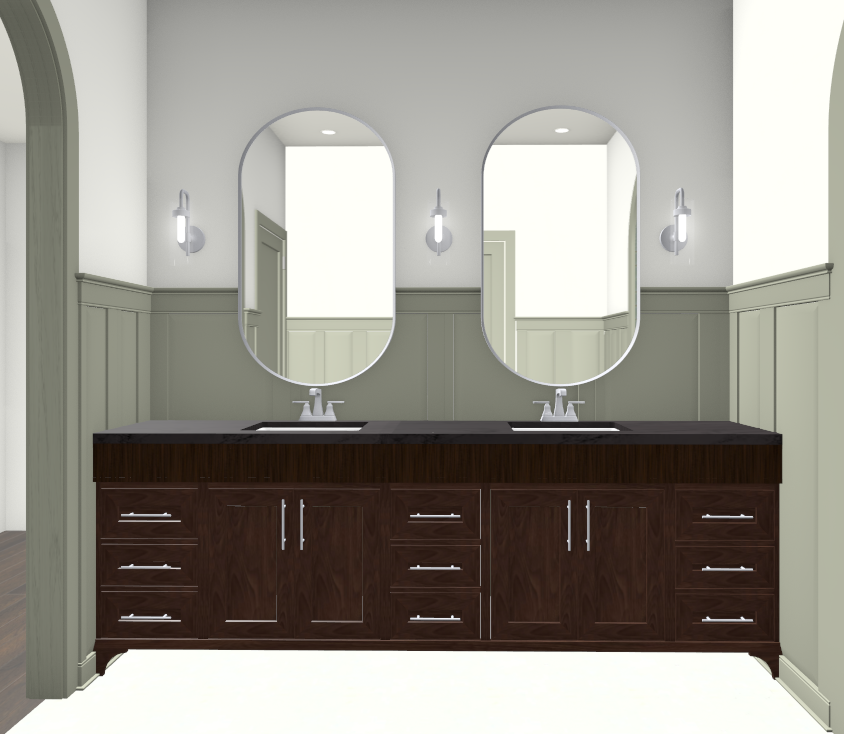primary bath vanity with inset cabinet doors please keep the room light section above cabinet doors is reeded cabinet color medium walnut countertop is black