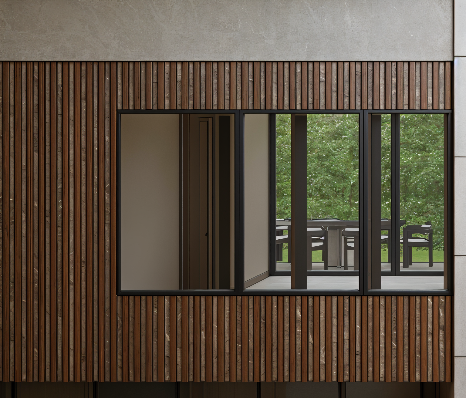 render this kitchen scene exactly as shown in the reference image do not change any materials colors finishes shapes or layout just render it in a photorealistic way the base cabinets are matte dark grey wall units and panels include vertical wood elements the backsplash is in a beige travertine like stone keep all the furniture appliances accessories plants coffee machine lamp in the same position lighting should simulate a warm late afternoon sunlight coming from the window on the left shadows and reflections should be soft and realistic enhancing the cozy and natural feel of the space important notes for the ai do not modify design or styling do not change materials or colors do not add or remove any objects only improve realism and lighting architecture
