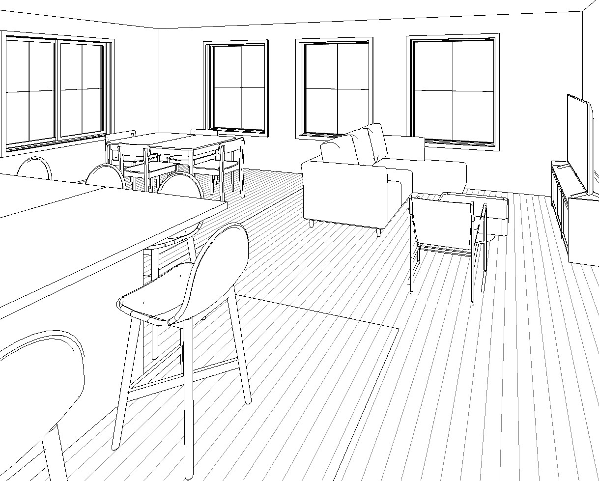 can you render this interior view for me i want the walls to be a warm white with light wide oak flooring marble countertops and black accents