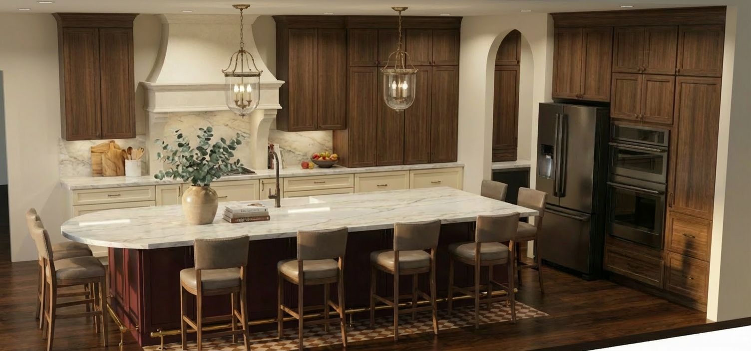 update the vent hood be a built in piece to sit on the counter with an arch and stucco texture more of a european style