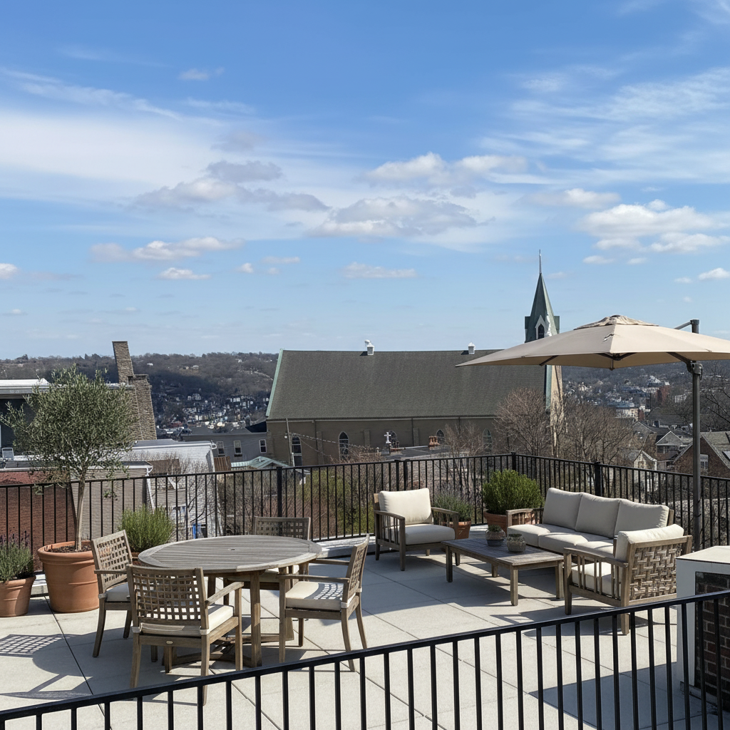 turn this floor plan with 3 apartments per floor modern tiles on the floor and modern furnitures