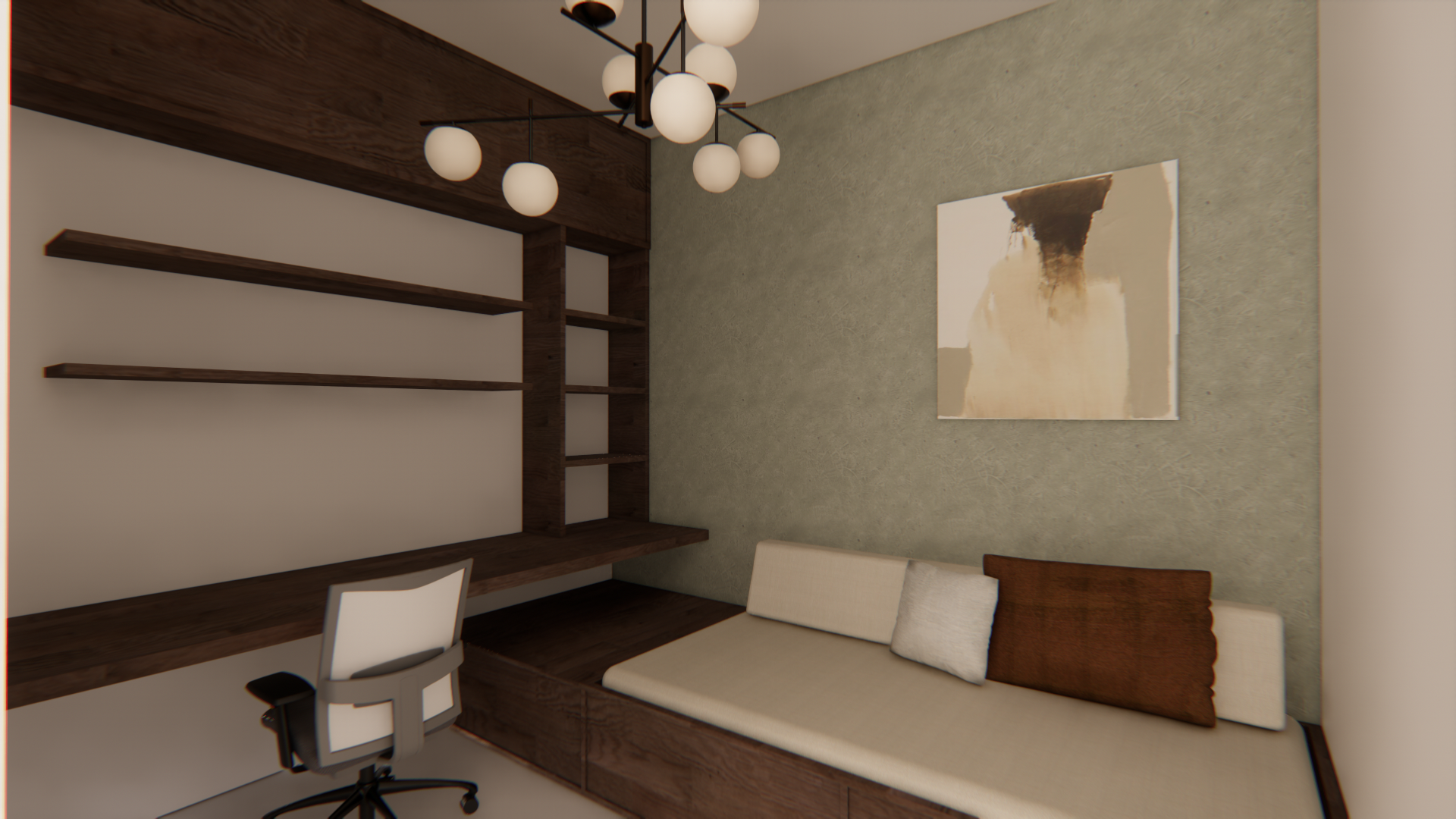 make this home office more cozy add books and decorative elements on the shelves add a computer screen a make the image more realistic turn on the ceiling lights