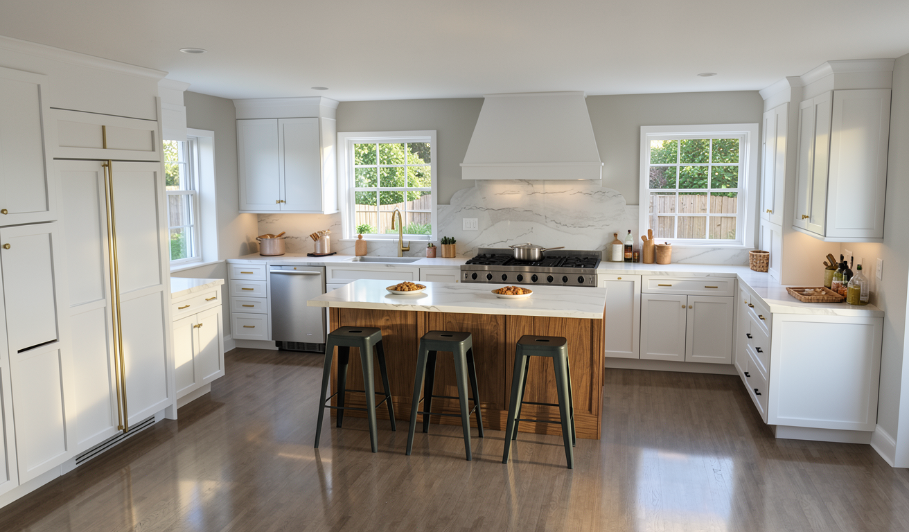 let s create a lifelike interior using this kitchen cabinet in a two story room with box coffered ceiling detail matching the profile on the top of this elevation set the vantage point back from this wall and put a large kitchen island in front the right side wall has more cabinets with a beautiful cooks range and hood