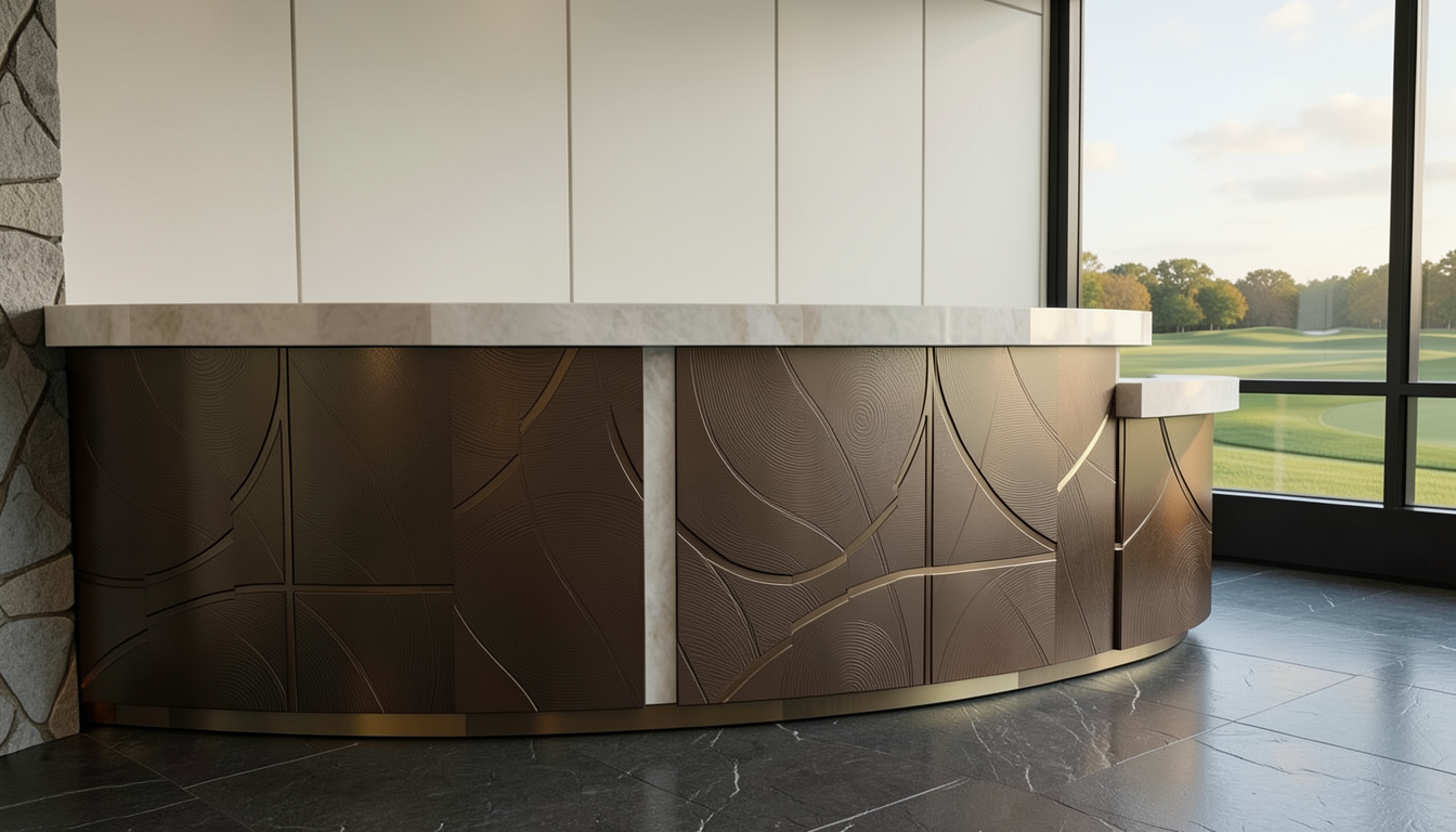 lightly accessorize this kitchen keeping counter tops fairly clear make the lights above the island appear on and keep the white herringbone backsplash and do not change the hutch or lighting shape maintain the color of the wood do not use a yellow lighting hue