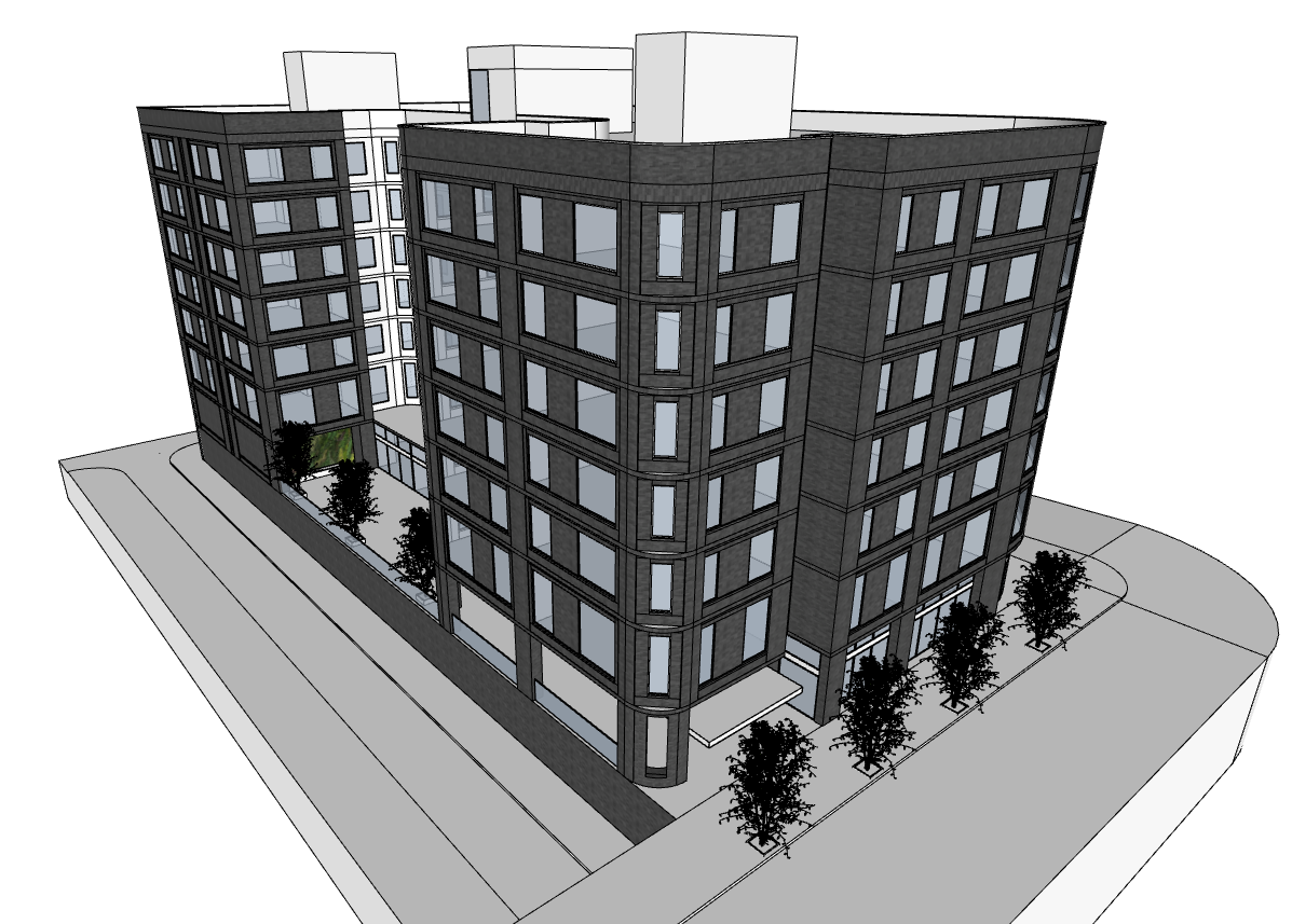 produce rendering of a warm red brick building with contemporary brick detailing all lintels and sills should be a solider course warm red brick windows should be black color industrial style provide curtain wall glazing at the ground level where the building curves material transition to vertical white siding at interior courtyard populate image with people and cars