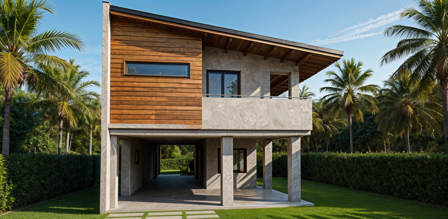 realistic architectural rendering of a modern tropical elevated house highlight a sleek modern staircase beneath the structure with dark brown horizontal wood cladding on the upper volume and a beige painted wall for contrast add a warm lighted wall lamp near the balcony door for ambiance emphasize natural shadows tropical daylight and warm materials with realistic lighting and textures use clean lines concrete columns and a minimalist tropical feel