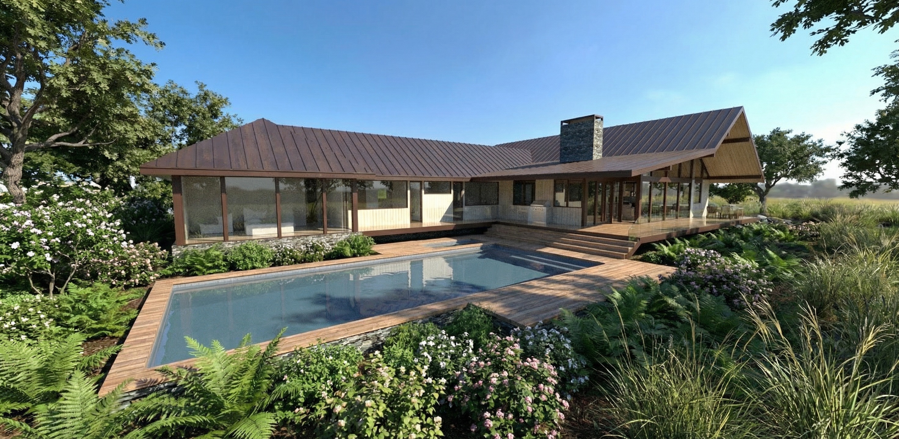 change the siding to ivory concrete and the stone foundation to painted bronze to match the roof