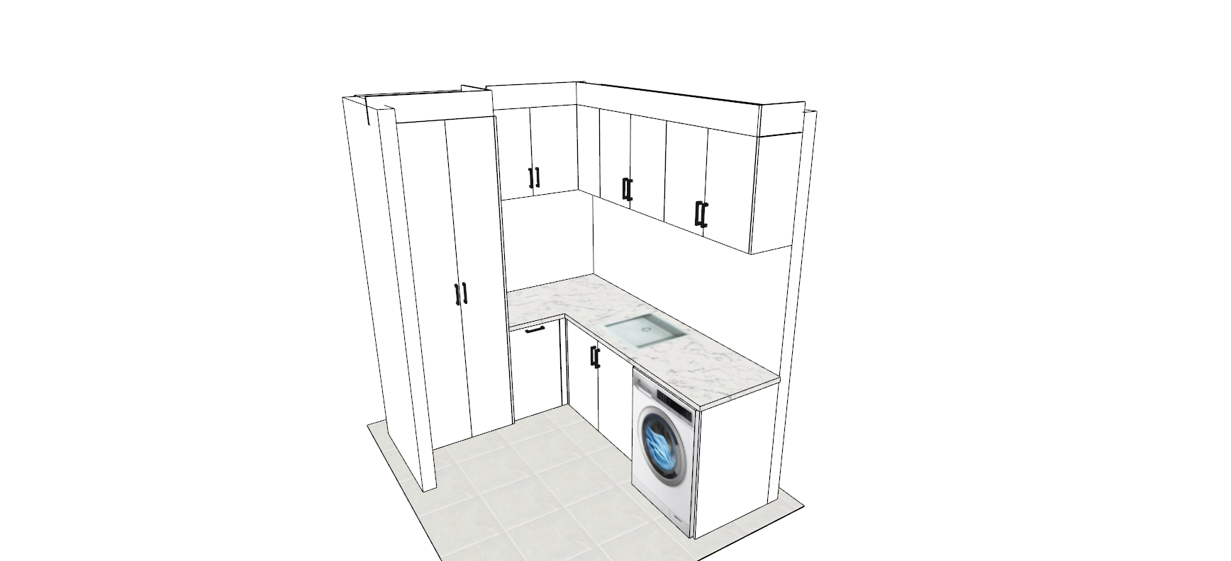 cupboards to be flat white panels put evening sunlight coming through clothes on a hanger under the cupboards over the sink
