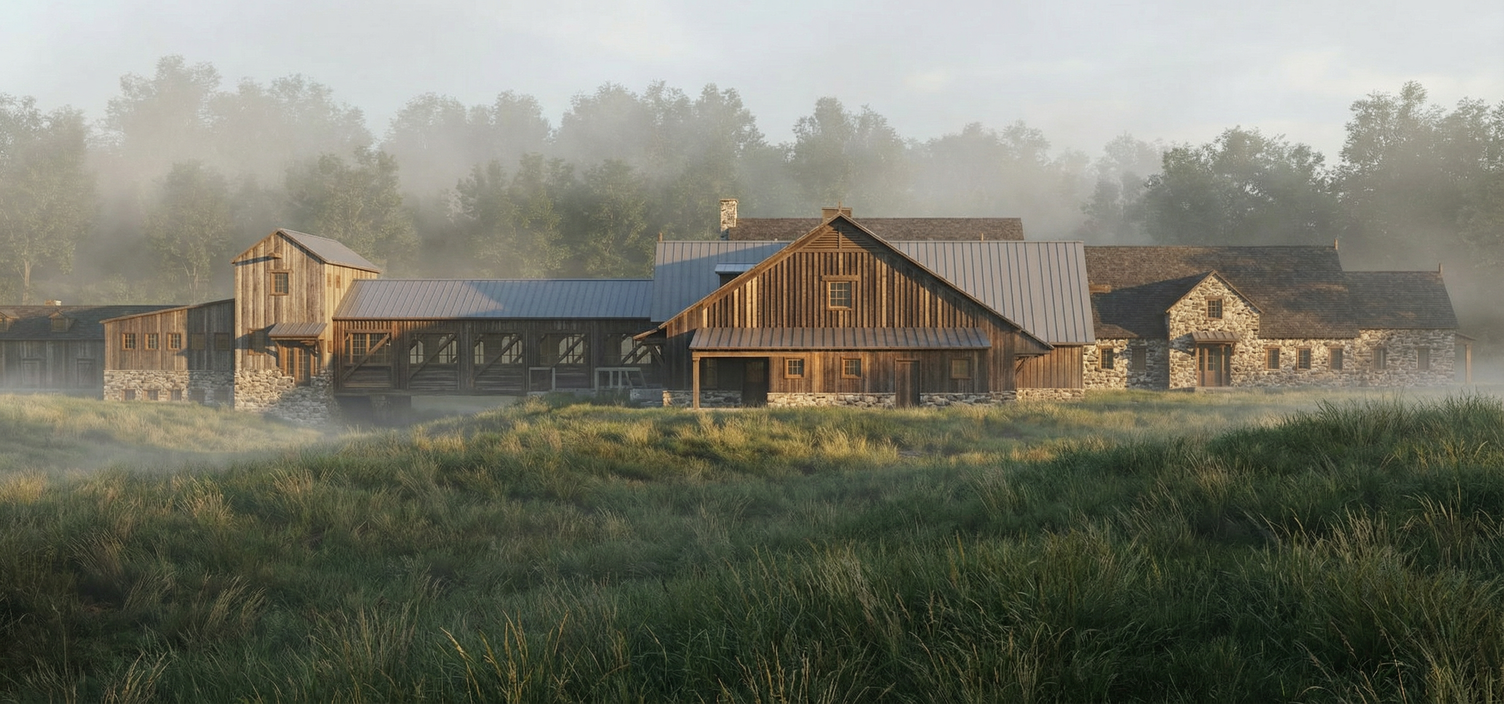 industrial design wood slat carriage house stone farmhouse to right vertical ship lap mill to left putting green with person in tall grass foreground fog trees in background sunlight on building face