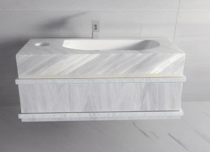 a small marble sink sits on an oak wood base the marble is light carrara the render has an empty white background