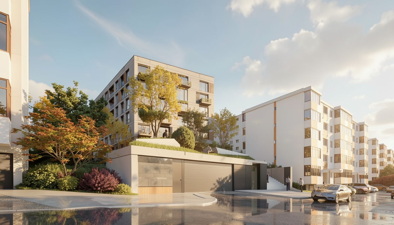 black frame windows dark brown front door cream colored trim red siding landscaping