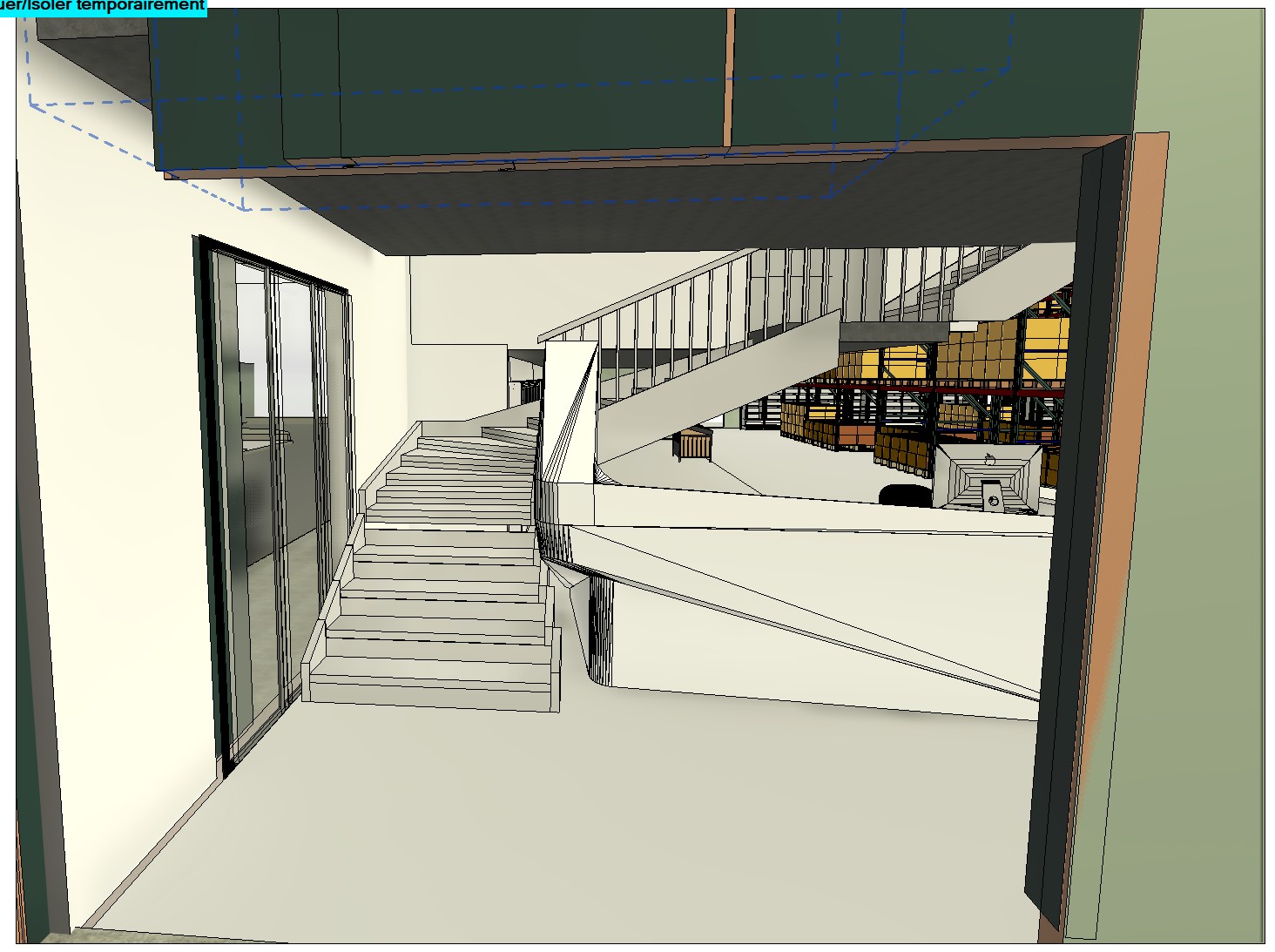edit the provided image to improve the continuity between the reception desk and the staircase the railing must start directly from the counter and flow continuously to the top without any breaks redesign the steps with variable widths wider on the right side to create a smooth curved effect while keeping the left side straight keep the original style materials colors lighting and atmosphere unchanged do not modify the overall architecture highly realistic clean professional result