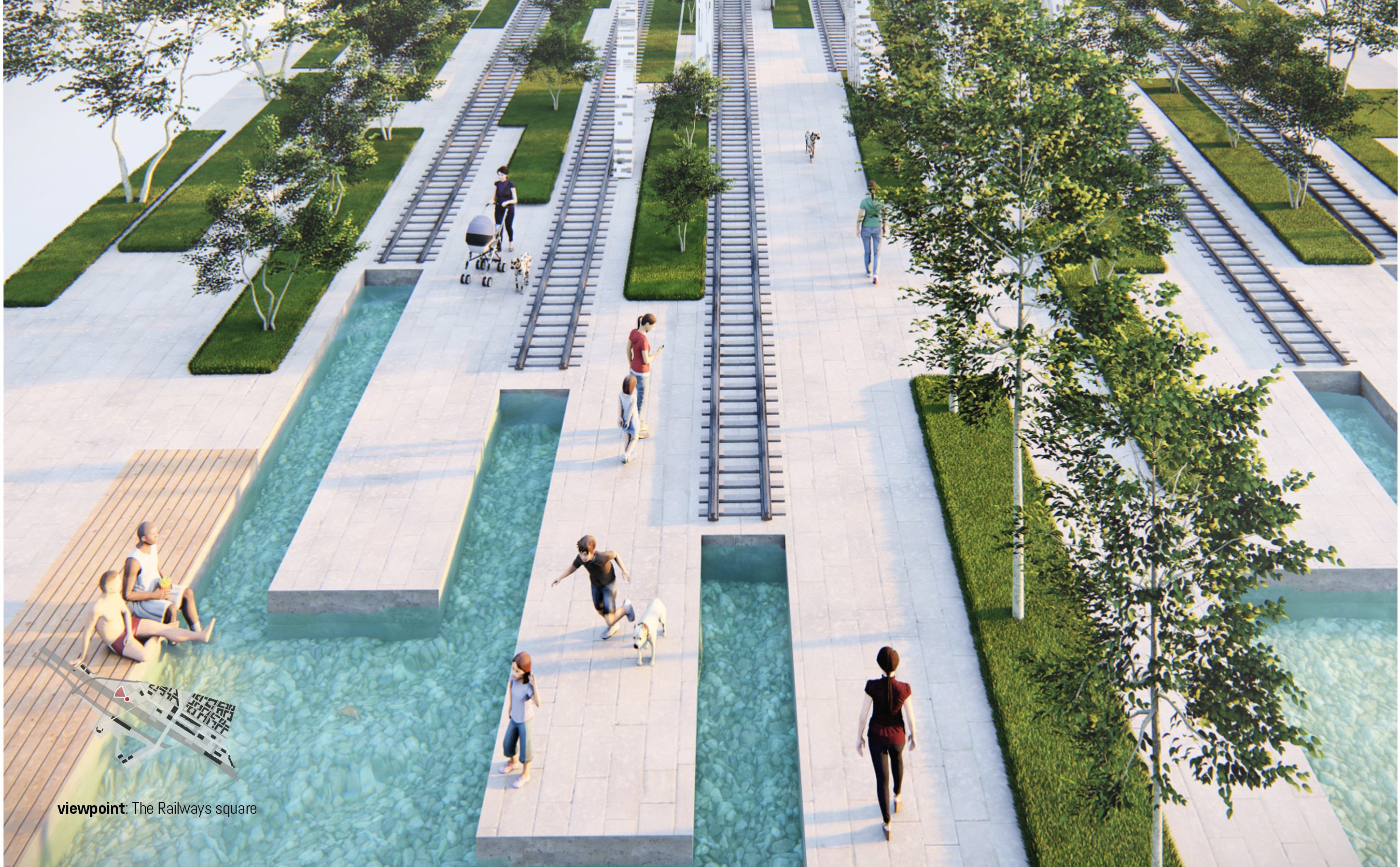 photorealistic architectural visualization high oblique bird s eye view looking down at la piazza delle ferrovie the railways square within the tre ponti urban development project scalo farini milan italy the square is organized around multiple preserved historic railway tracks running in parallel bands across the frame their steel rails and concrete sleepers repurposed as landscape elements within a contemporary public plaza between and around the tracks rectangular shallow water channels with geometric flush concrete edges reflect the sky with clear turquoise blue water creating a calm reflective pattern across the square the main paving surface is large format light grey limestone or concrete pavers with fine joint lines smooth and clean flat rectangular turf panels neatly trimmed grass fill the spaces between track zones flush with the paving level on the right side a row of slender white barked birch trees with light green canopy line the edge of the square their trunks bright against the greenery additional trees are visible in the background distance on the left foreground a warm timber deck platform sits at grade beside a water channel with two people seated casually a mother pushes a stroller with a dalmatian dog nearby a child runs playfully toward a white dog in the central paving zone a woman walks alone along the central axis another person walks a dog in the middle distance soft warm diffused daylight slightly overcast northern italian sky no harsh shadows gentle ambient light ground materials grey stone pavers steel railway tracks on concrete sleepers trimmed grass panels clear shallow water channels warm timber decking ultra high detail realistic depth of field global illumination ambient occlusion cinematic 16 9 format