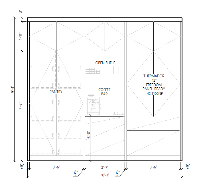 built in wall of cabinetry all navy blue with brass hardware in the coffee bar we want a dark red tile at the back and a dark green countertop the sides are just white drywall wing walls make the cabinet style very slim shaker no glass on the pantry doors
