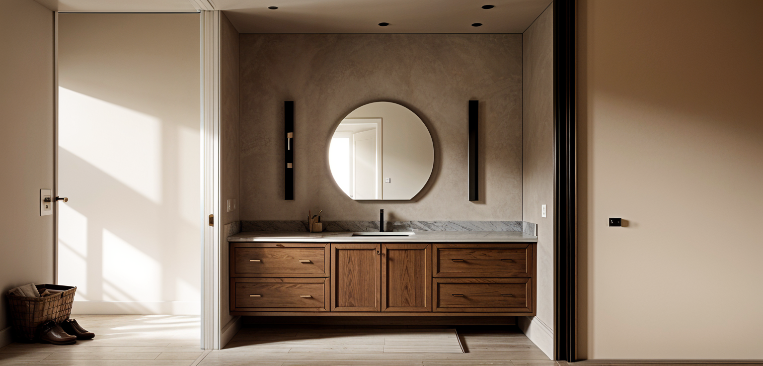 modernist interior shot industrial coworking space wooden details white walls concrete floor light ambience architecture
