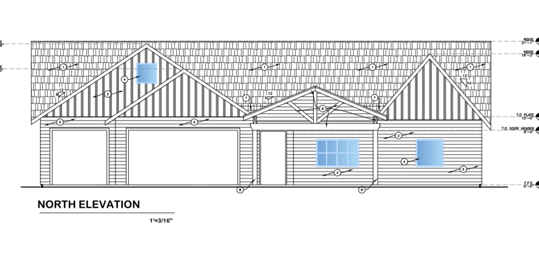 take stone full height to peak on the single garage bay and the right gable bay paint the exterior sherwin williams alabaster with the fascia painted in sherwin williams iron ore the peaks on the second garage bay will be board and batten while the lower part of the second garage bay will be painted alabaster the porch wall will be board and batten painted in the alabaster paint the gable trim and brackets in a medium wood stain create a green grass front landscaping