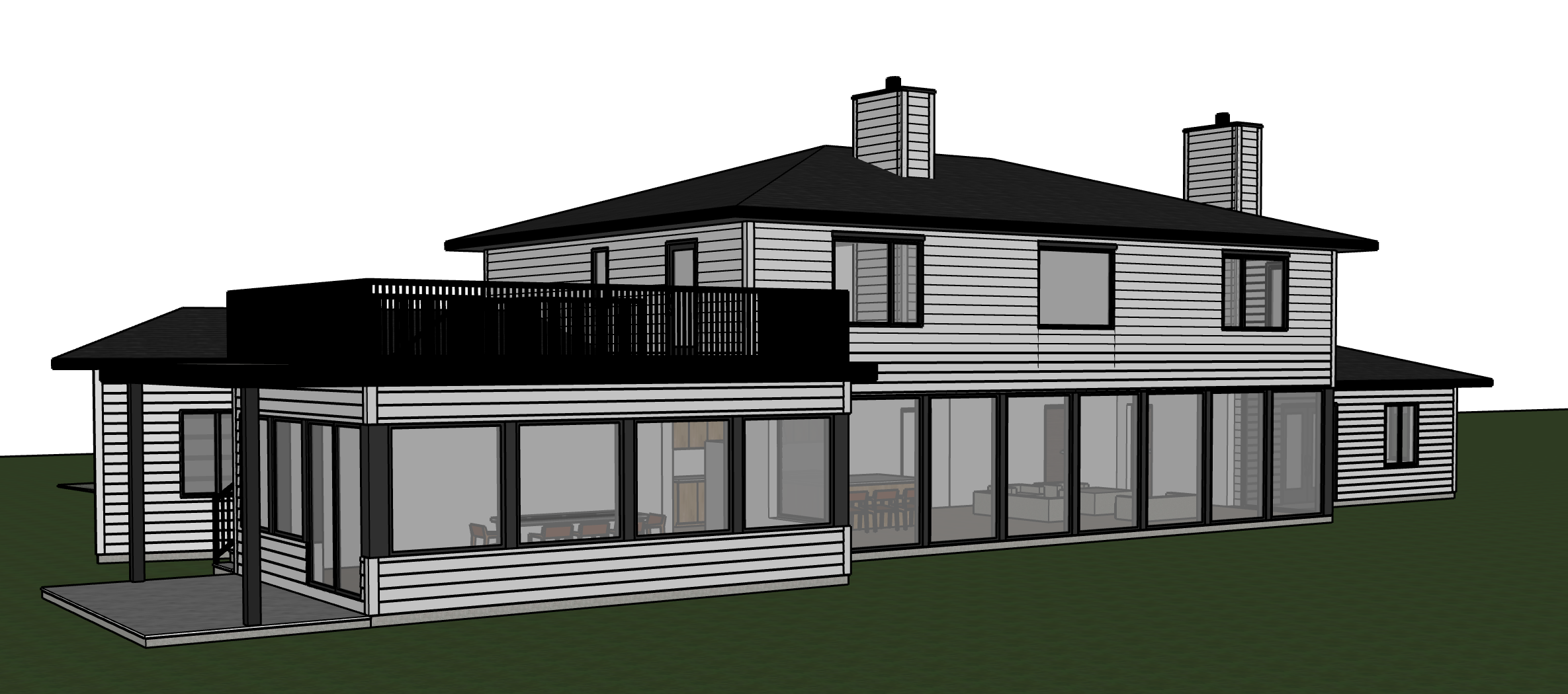 watercolour rendering no changes to architecture in image provided white siding for exterior roof are black add some subtle landscaping local to qc forest in background railing in model is black iron rods do not add in any additional railings not already in the model do not add any pathways this is the rear side of the house show grassy yard make windows and glass doors opaque so we don t see inside of house make it so they are not see through make landscape more rocky with gravel