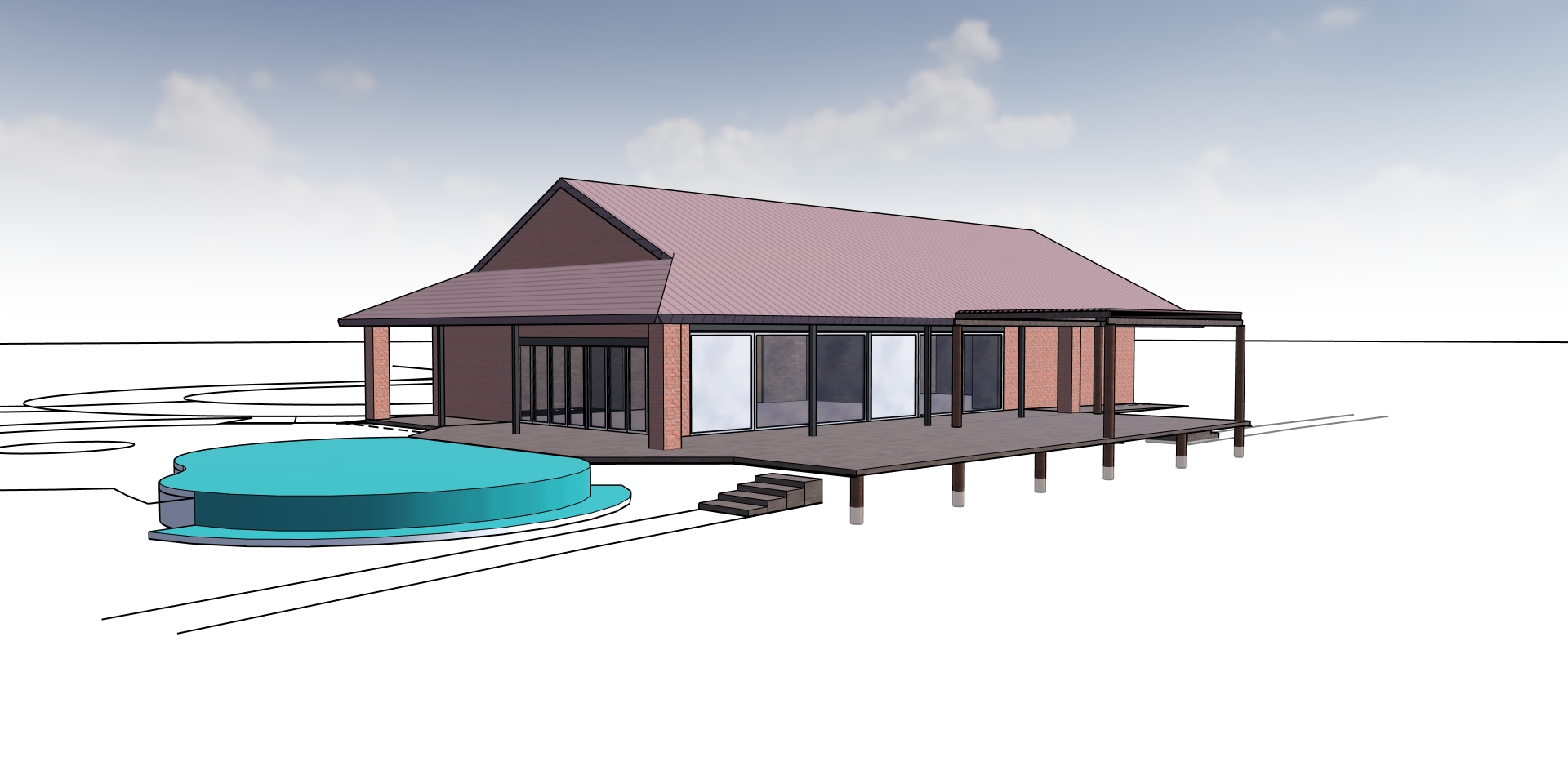 a typical south african bushveld lodge with spanish roof tiles a dark facebrick and timber lathe pergola over the deck