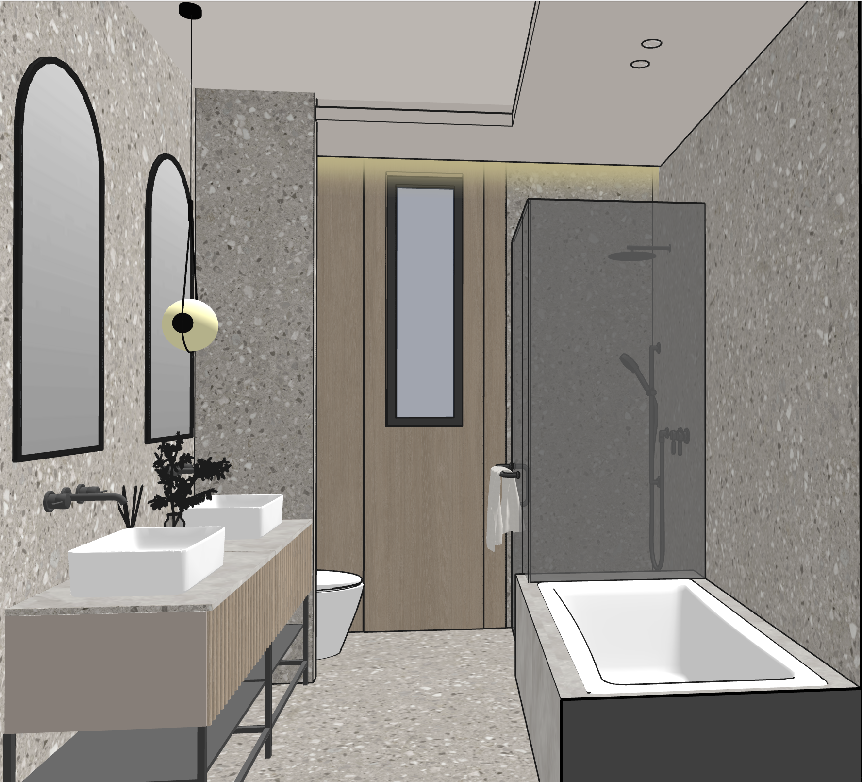 render a modern and elegant bathroom with warm lighting and a serene atmosphere the walls are polished gray stone with a subtle texture feature a floating vanity with a beige wood finish and white above counter sinks paired with sleek matte black fixtures add a large bathtub with a white interior and a light gray exterior the floor is a light gray terrazzo introduce two arched mirrors on the wall framed in black include a modern pendant light with a soft yellow glow a wooden door with a frosted glass panel is on the back wall framed by gentle ambient lighting at the top the overall ambiance is calming and sophisticated cove ceiling with led recessed light
