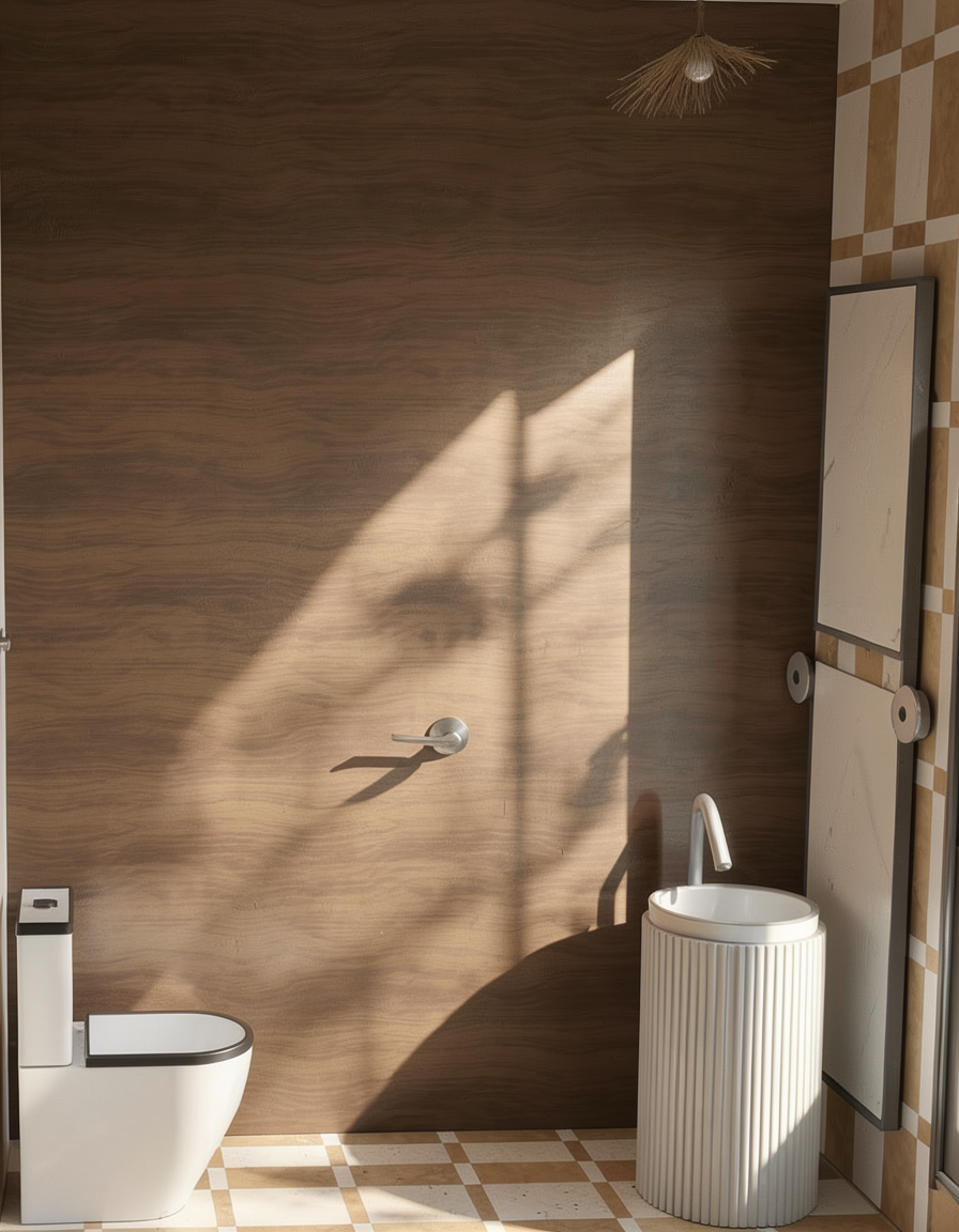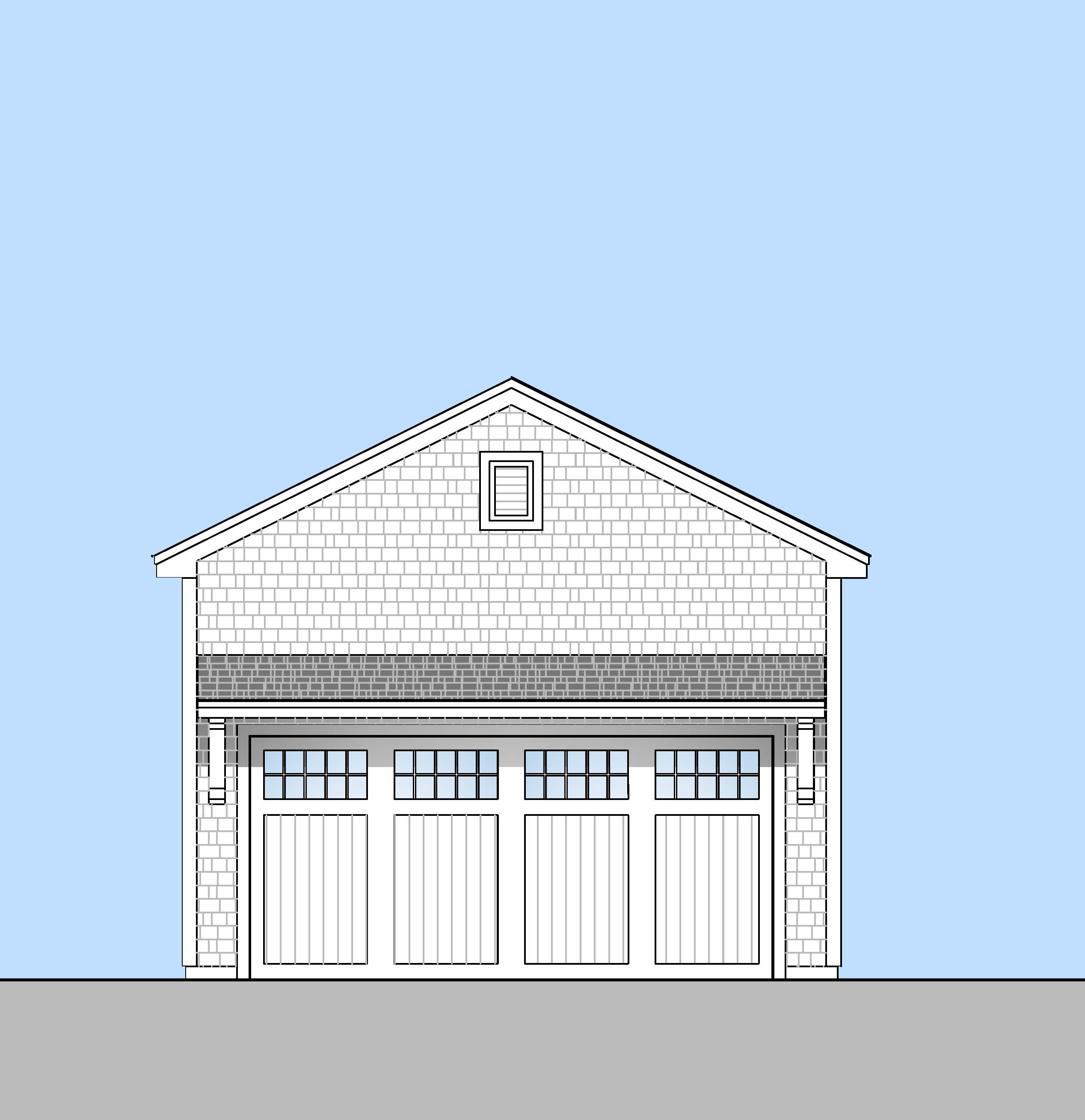 weathered cedar shingle siding white trim brown brackets dark grey roofing blue sky 6 foot white fence in background asphalt driveway width of door no houses in background