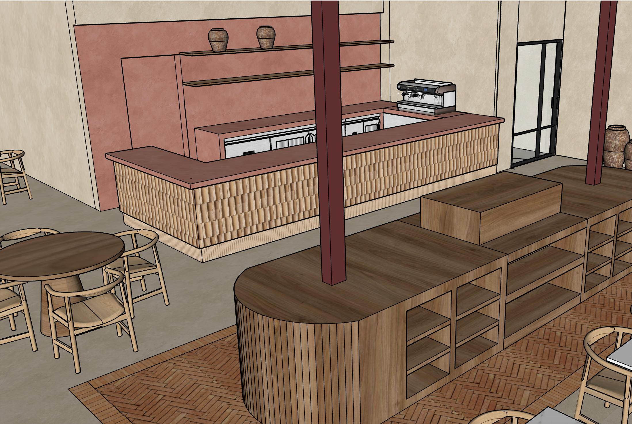 la parte frontal no son tejas son azulejos de 6x 25 colocados alternos uno de canto y otro de frente a ade un led en el per metro de la barra y otro en la trasera mirando hacia abajo en la union del microcemento beige y del terracota dale a todo un aspecto wabisabi