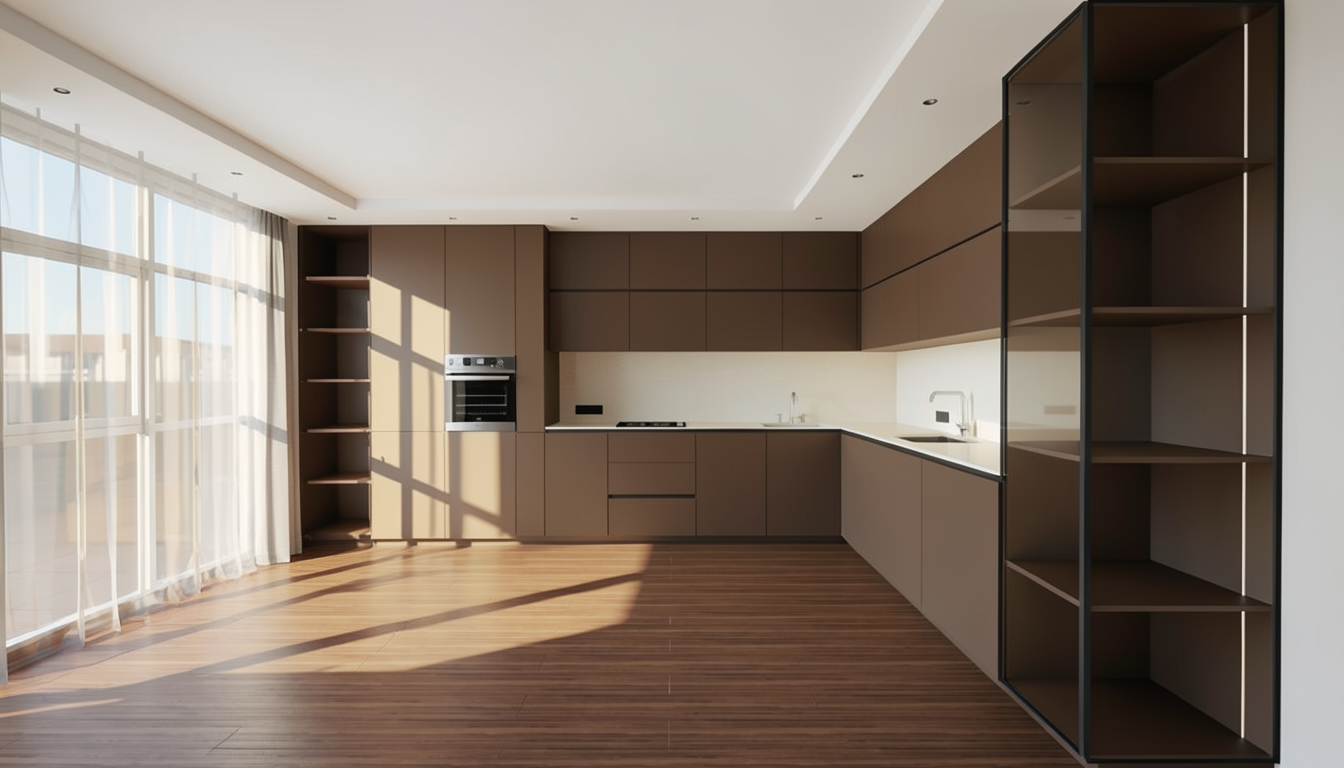 create a top down architectural plan view using the uploaded pergola structure and dimension reference the pergola must reflect its true full footprint approximately 32 feet wide approximately 22 feet deep includes the full right side angled extension as shown in the dimension drawing do not compress or reduce the pergola size the structure should feel expansive and large scale maintain correct structural spacing between pergola beams and columns inside the pergola left side against pool house wall a linear outdoor kitchen approximately 13 14 feet long include pizza oven grill sink prep space and refrigeration kitchen should occupy only a portion of the full width leaving significant open space center a rectangular island 8 10 feet long placed parallel to the kitchen maintain 42 48 inches of space between kitchen and island right side leave open space to show full scale of pergola do not fill this area with furniture important the island and kitchen must feel proportionally smaller within the larger pergola footprint emphasize open negative space to communicate scale camera top down view but slightly elevated not perfectly flat to show depth wide framing to include entire pergola footprint edge to edge style minimal architectural rendering light neutral materials clean concrete flooring no landscaping no pool no furniture focus on accurate scale spacing and proportion above all else