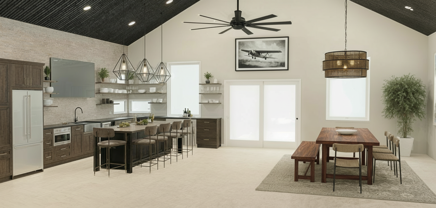 sacar un renders con texturas realistas en un entorno de atardecer claro y que la casa tenga luces