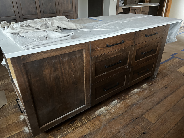 do not change the cabinets in any way preserve the exact cabinet colors materials finishes dimensions door and drawer styles hardware spacing alignment and all geometry exactly as shown do not alter the countertop shape backsplash appliances flooring lighting fixtures or wall structure only remove the construction materials clutter and mess from the scene clean the room and make it look finished and staged add a few simple tasteful home accessories appropriate for the style of the space but do not add or remove any furniture windows or architectural elements maintain the original lighting direction and realism enhance clarity and polish the photo while keeping the cabinetry and room design completely unchanged do not alter the lighting to keep the cabinet colors as they are in the image add new flooring stage the countertops for a kitchen put a microwave drawer in the opening at the end of the island do not change the cabinet color at all