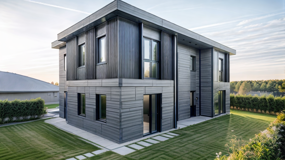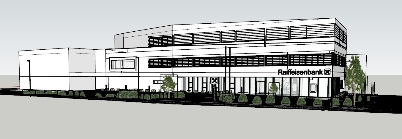 modernist exterior shot generate a photorealistic architectural rendering of a contemporary office building designed for raiffeisenbank lieboch austria based on the 3d model in the attached image the building retains the exact volumetry and geometry as in the original sketchup model from the image a clear two story volume with sharp rectangular lines glazed panels alternating with vertical fa ade fields the entire fa ade is clad in vertical timber louvers glowing subtly from within as internal lighting highlights the pattern interior lighting reveals glimpses of modern office spaces the scene is captured at twilight with the sky transitioning to a soft blue gray dusk tone the warm glow from the inside of the building creates dramatic light contrasts through the perforated timber fa ade and glass panels hinting at human activity inside people working walking interacting all architectural details of the original 3d massing and fa ade structure are preserved exactly vertical fa ade louvers and orthogonal geometry the exterior public space is landscaped with ornamental grasses integrated concrete benches the street in front is framing the scene the mood is elegant and industrial evoking strength permanence and innovation lighting is balanced crisp reflections on the facade soft shadows from vegetation and warm tones from interior spotlights ultra high resolution photorealistic style captured as if for a high end architectural magazine like archdaily or detail cinematic composition sharp detail architectural realism architecture