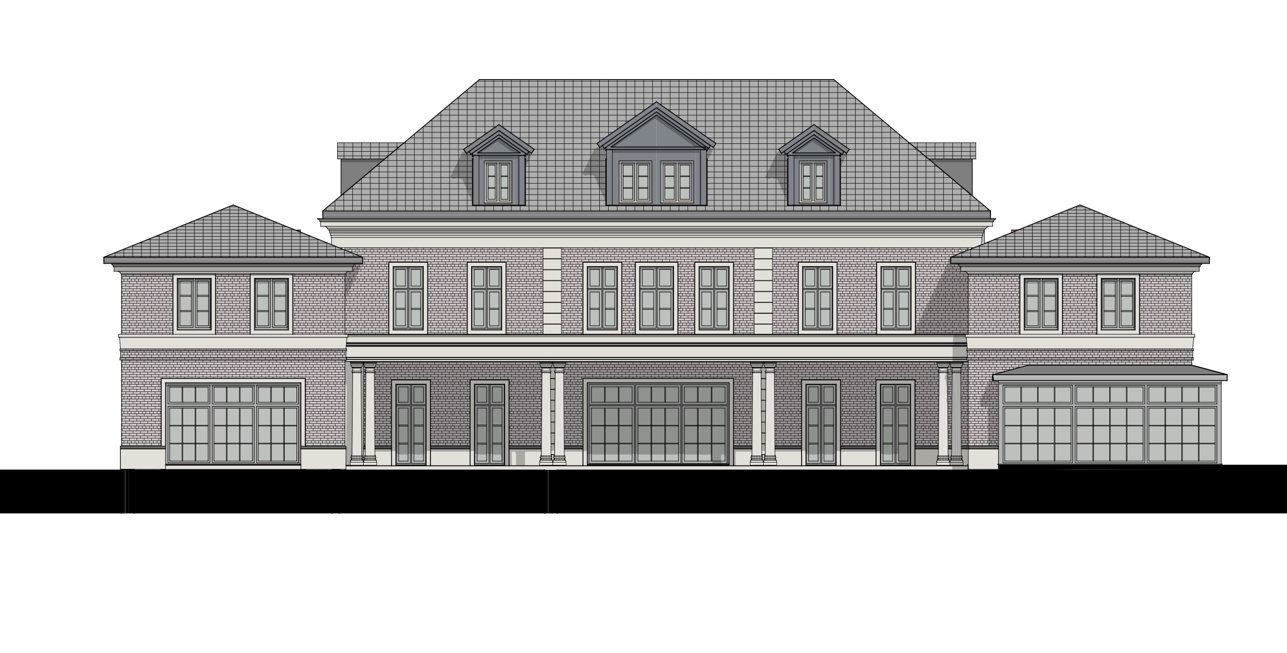 visualisierung eines repr sentativen symmetrischen herrenhauses im klassischen stil zweigeschossig mit ausgebautem dachgeschoss hellrotem schwach ges ttigtem ziegelmauerwerk naturstein sockelzone s ulen und gesimsen in grau beige im erdgeschoss bodentiefe fenster alle proportionen ffnungen und bauteile fenster d cher tore umfassungen gesimse aus der skizze exakt beibehalten nur materialit t licht umgebung und detailtiefe realistisch ausarbeiten zentrale hauptfassade mit terrasse terrassen berdachung tiefe ca 4m ber die ganze breite mit s ulen gleichm ige fensterachsen stehende fensterformate hellgraue holzfenster die seitenfl gel mit walmd chern garagentoren im erdgeschoss in klassischer gestaltung die seitenfl gel sind baulich mit dem zentralen hauptbauk rper verbunden und springen gegen ber der ebene der hauptfassade deutlich um ca 5 m nach vorne auf der rechten seite tritt eine wintergartenverglasung aus dem seitenfl gel heraus mit gewalmtem dach die gesamtfigur ist u f rmig der mittelbau liegt um ca 5 m zur ckversetzt gegen ber den beiden seitenfl geln dach geneigtes satteldach mit deckung mit flachen dachsteinen in dunklem anthrazit symmetrisch angeordnete gauben materialit t hellrotes schwach ges ttigtes klinkermauerwerk naturstein grau beige f r sockel fensterfaschen und gesimse hellgraue holzfenster hochwertige handwerkliche anmutung vordergrund au enanlagen gro z gige klassische gartenanlage mit rasenfl chen b umen das grundst ck ist breiter als das geb ude keine hecken als grenze an das geb ude setzen sondern ca 8 m entfernt ein gro er alter laubbaum im vordergrund links als raumbildendes element personen im bereich der terrasse umgebung parkartige landschaft mit alten b umen gepflegter rasen g rtnerisch angelegten b schen ruhige hochwertige atmosph re links und rechts vom geb ude keine begrenzung hecken dort garten mit b schen und rasen anlegen lichtstimmung weiches tageslicht leicht sonnig nat rliche farben realistische schatten betone die tiefenstaffelung durch realistische schatten in den r ckspr ngen keine flachgeb gelte fassade kameraposition perspektive auf augenh he leichte distanz vollst ndige fassadenansicht keine extreme weitwinkelverzerrung kamera leicht 3 4 frontal nur minimal keine starke perspektive damit die tiefenstaffelung der bauk rper klar lesbar ist stil realistische architekturrendering visualisierung hochwertige wettbewerbsdarstellung keine menschen im vordergrund dominierend ruhige szenerie qualit t hohe detailtiefe realistische materialien fotorealistisch klare geometrie ruhige komposition
