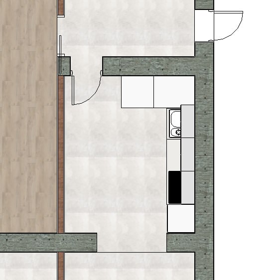 mke a top reneder of this flor plan add textures and add a table for 4 persons in the kitchen