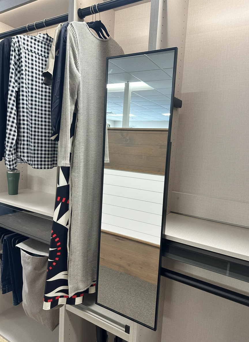 add natural light remove the coffee mug restage the hanging clothes change the reflection to a bedroom