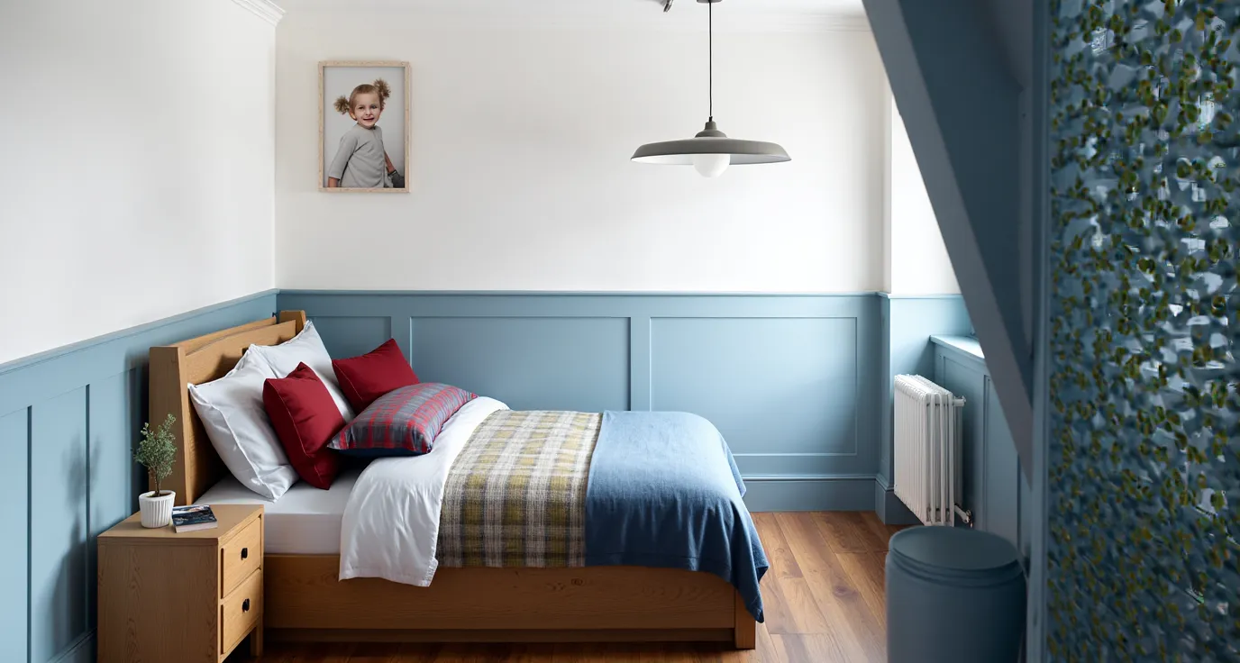 boys bedroom with a scan vibe off white ceilings and tops of walls muted baby blue bottom of walls muted mid denim blue skirting boards door frame and wardrobe doors warm grey oak tones soft furnishings and pops of colour along with layered lighting creates a luxe space for interior design clients