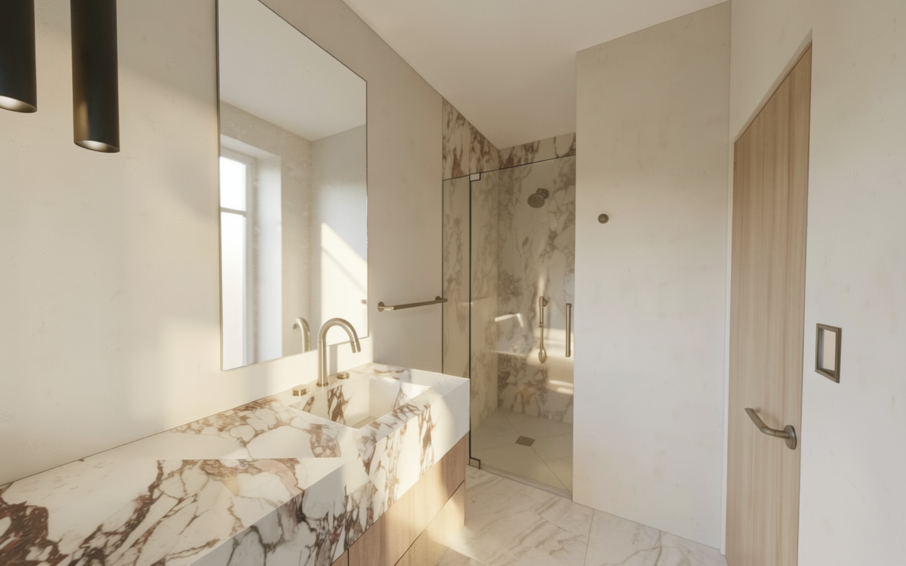 backlit mirror surrounding walls plaster floor is off white limestone natural lighting with light from window not shown
