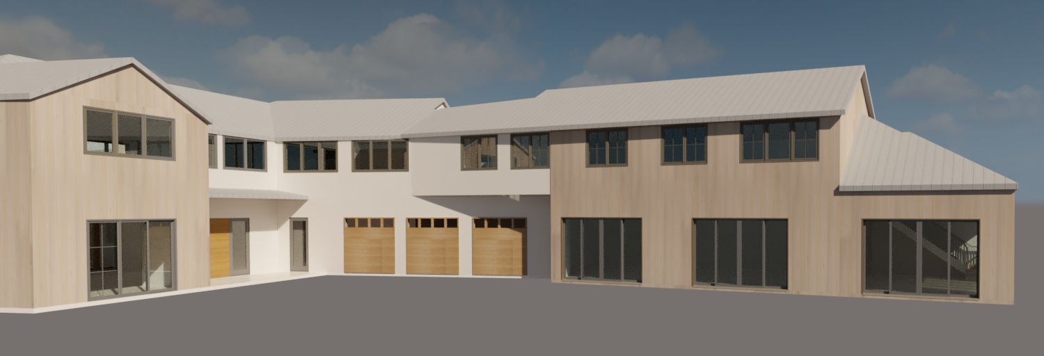 make this view look more realistic the ivory area is smooth eggshell stucco in a beige color and the timber is a light white oak wood plank installed vertically the window and door frames are dark anodized bronze and the roof is a silver aluminum standing seam roof make a blue sunny sky with a few clouds give soft shadows for dimension add a light concrete driveway with a few stucco planters that have mediterranean style plants add one olive tree