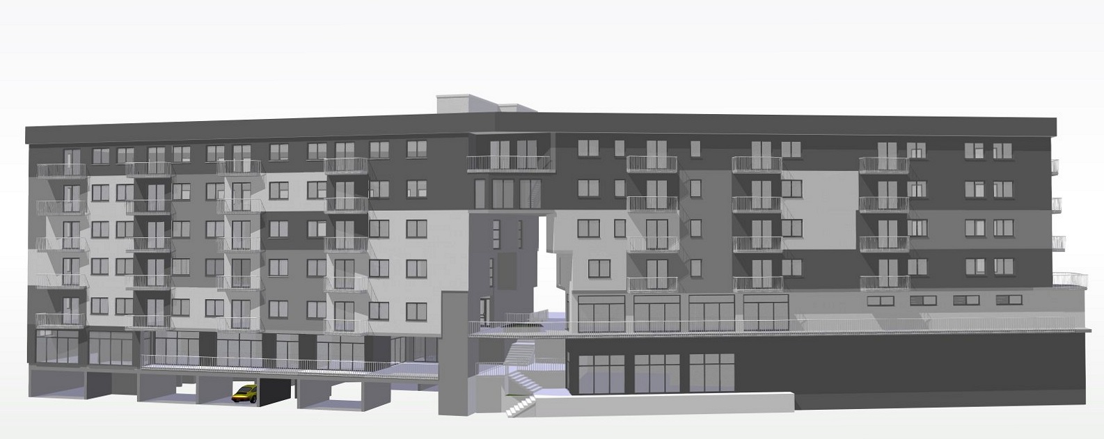modern mixed use residential and commercial complex with a focus on the roof parapet attic clean contemporary architecture with a strong horizontal emphasis subtle horizontal joints precise detailing minimalist expression integrated linear led lighting hidden on the inner side of the parapet soft warm light at dusk neutral facade tones gray anthracite light gray large window openings urban european context realistic materials high architectural realism no structural changes