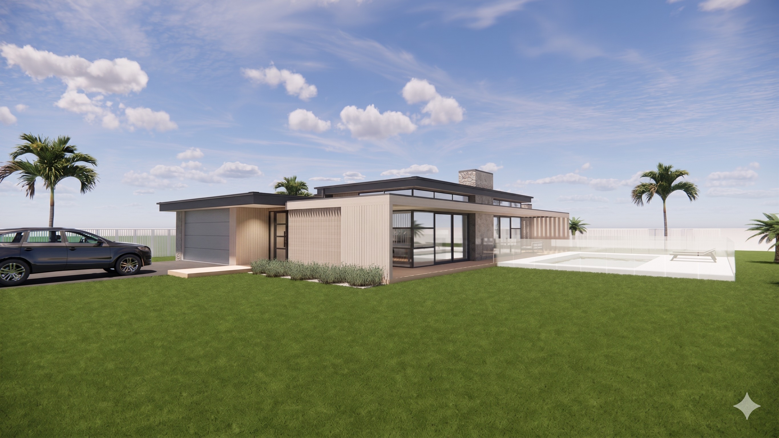 modernist exterior shot enhance this architectural render while preserving the building form exactly critical do not change the layout proportions rooflines or window positions preserve the recessed front entry beside the garage exactly as shown do not simplify or flatten architectural depth architectural corrections must be applied accurately garage fa ade introduce a clear horizontal break above the garage door add cladding above the garage door ensure cladding does not run continuously from the door to the soffit fascia change all fascia boards to a consistent dark colour match across all roof edges deck reduce the length of the deck so it aligns realistically with the house footprint avoid the deck extending too far beyond the fa ade composition zoom in closer to the house reduce empty foreground and side space focus on the front corner garage and entry maintain a natural eye level perspective remove remove the car remove the pool and pool surrounds replace with landscaping add realistic new zealand native planting use species such as flax harakeke carex grasses hebes and low shrubs avoid tropical or coastal plants no palm trees create layered planting with natural spacing include simple gravel or mulch garden beds style clean contemporary new zealand residential setting warm timber tones with dark contrasting elements soft natural daylight slightly warm constraints do not redesign materials beyond specified corrections do not move or alter the garage or entry keep the architecture as the primary focus architecture