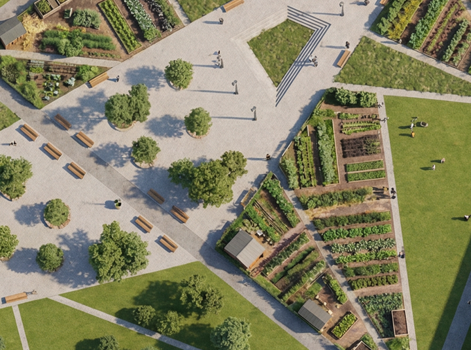 fai una vista render all altezza di un uomo che cammina all interno degli orti urbani a filari mantieni alberi e arredo come persone e panchine