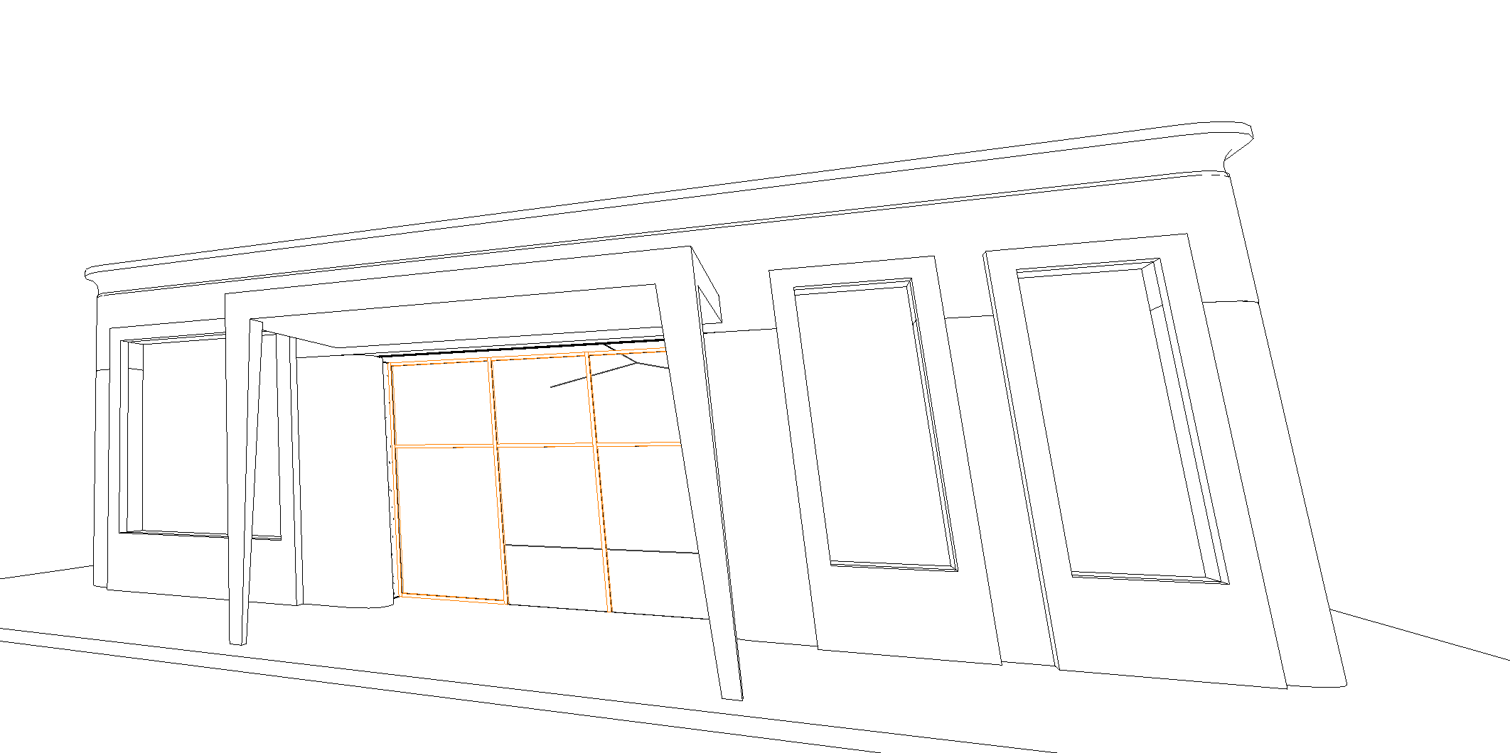 make this building look like a luxury immersive experiential gallery sales center using stucco for the exterior walls cherry horizontally veined inlet on the left with indirect lighting metal dark broze mate canopy with indirect lighting on the ceiling dark broze framing for central curtain wall and central door the same to the two windows at the right side add lighting from the floor to highlight building features make the whole design luxe