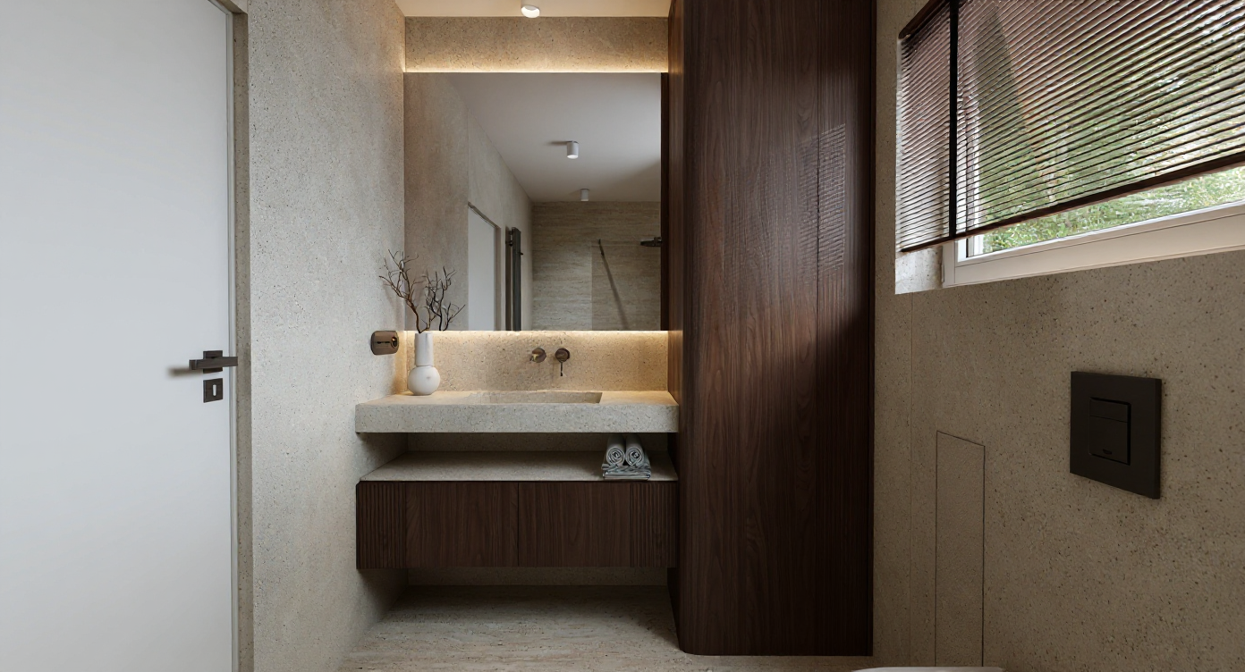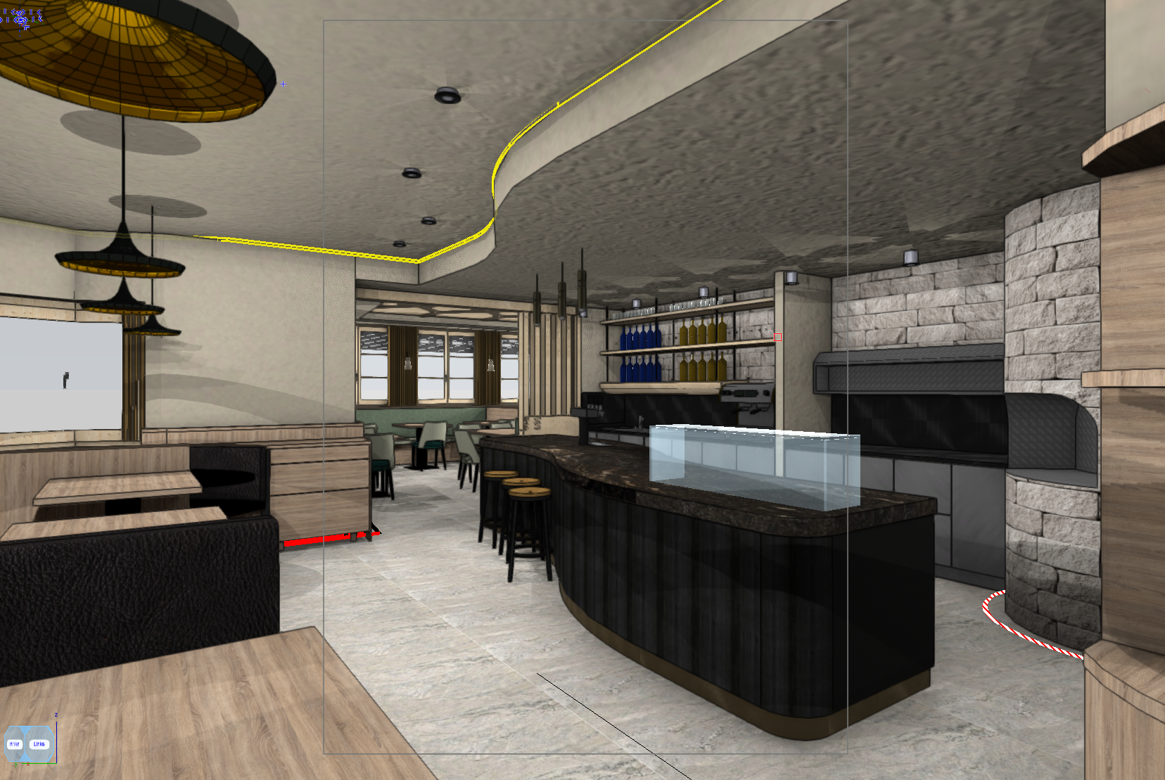 render a cozy modern caf interior with a warm atmosphere use soft lighting with golden yellow hues for the pendant lights the ceiling should be a smooth cream color with subtle recessed lighting in gentle white the walls are to be clad in light stone texture emitting a warm beige tone the bar counter should be sleek black with a polished dark brown marble surface for the seating incorporate deep black leather booths and light wood tables complemented by dark green upholstered chairs the floor is adorned in a light gray marble finish adding to the elegant ambience use accents of natural wood and soft tones for a contemporary yet inviting environment