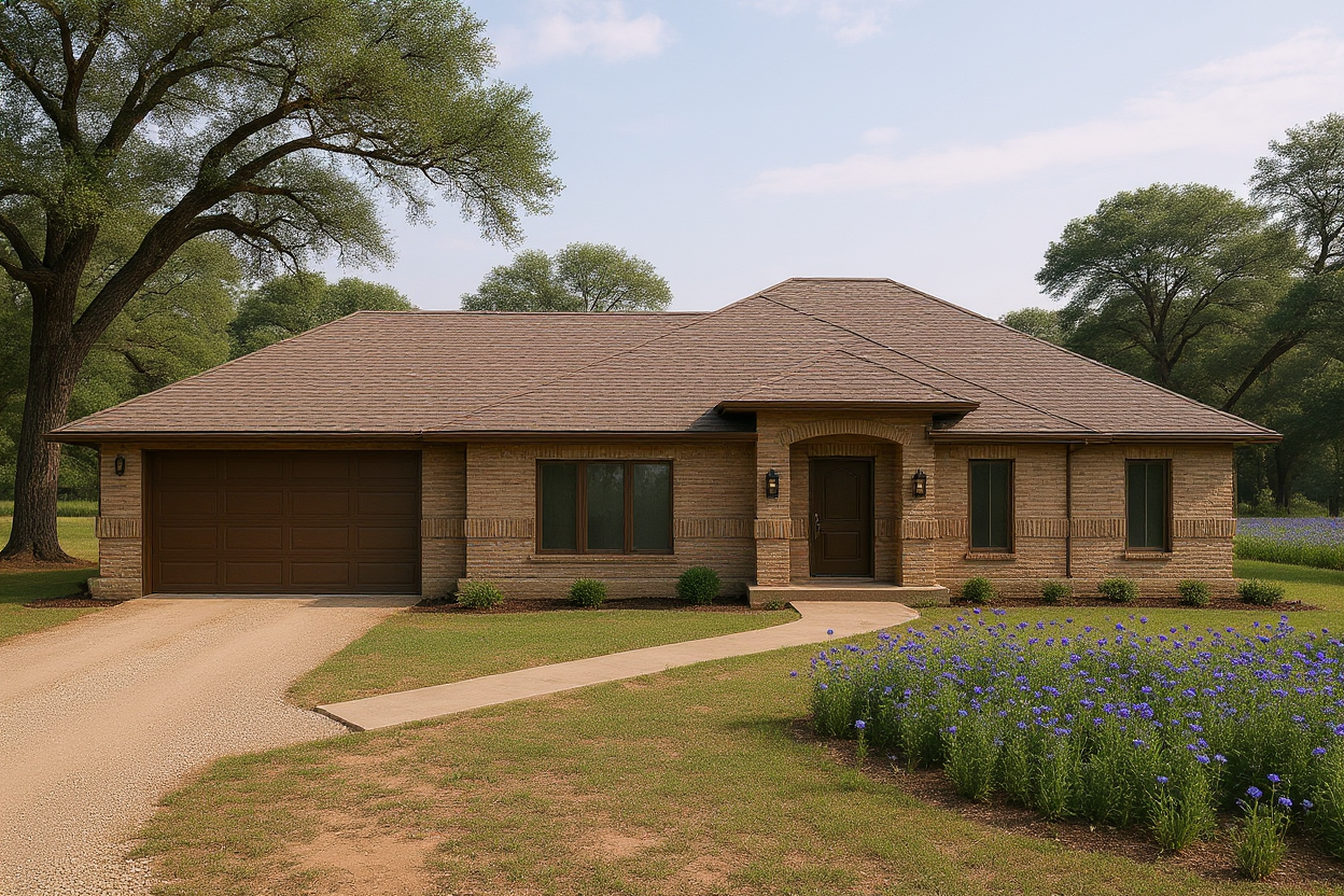 texas farm land setting with medium height foundation planting mottled brown roman brick bronze paint on doors windows fascia cream colored window frames oak trees in yard taper walk up to front porch gravel drive to garage door infill yard with fields of blue wildflowers in yard ramp sidewalk up to front porch ledge at base of house is concrete wall lights both sides of garage door