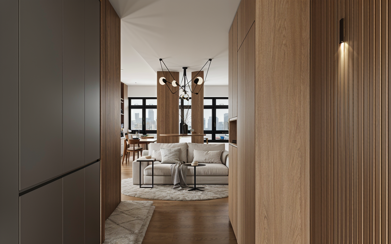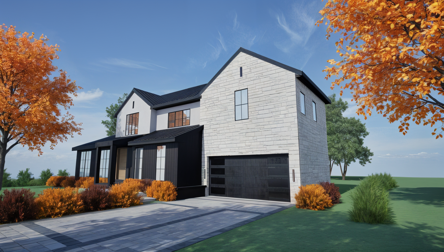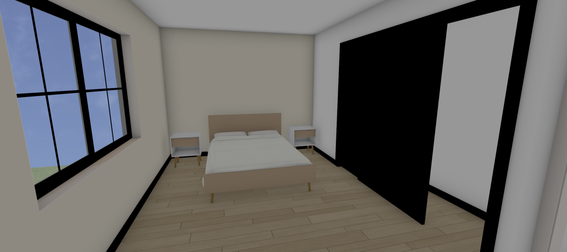 a photo realistic modern bedroom with sunlight streaming brightly through the large black framed window casting natural light and soft shadows across the wooden floor and walls the room features a beige bed with white bedding two minimalist bedside tables with light wood legs and a sliding wardrobe with a black door all dimensions proportions and furniture arrangements remain exactly as shown with a clean and minimal interior design