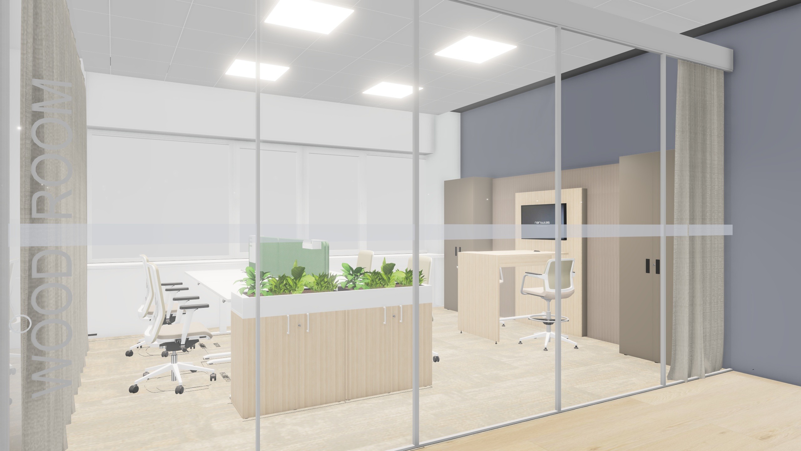 make it look photorealistic keep original colors and finishes make it look like a workplace for 4 people add the view of a plain field behind the windows cieling is armstrong plates keep the color of the walls keep the structure of the windows in the back wall all 4 workplaces are by the desks in the center 2 of them are oriented from left to right another 2 from right to left add 4 modern looking office type pendant lights above the desks