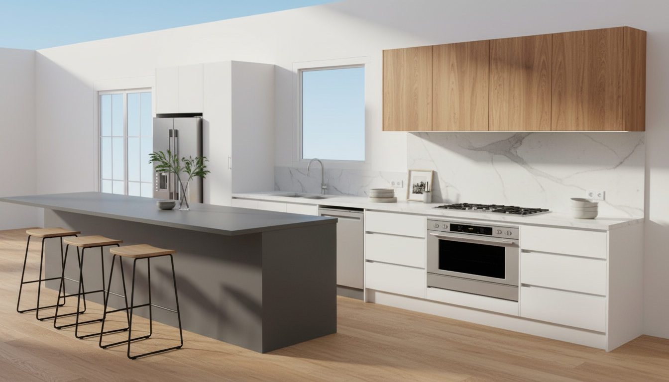 add kitchen decor someone standing at the cooktop and add ceiling in white add natural light coming through the windows add led strip under overheads change island benchtop to white