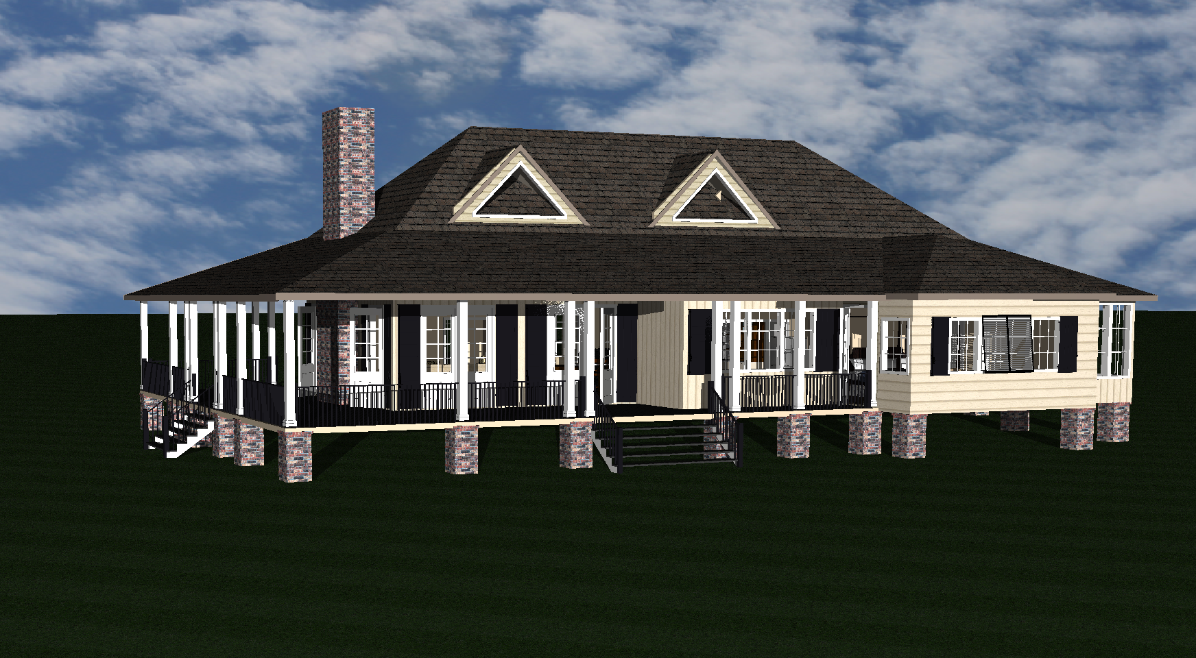 exterior shot low country style home chimney and piers should be antique reclaimed brick siding should be a soft latte color all shutters should be black roof should be black standing seam metal the windows on the porch and all doors should look like a new orleans style door with 5 8 glass and a wooden panel on the bottom ultra photo realistic set on a sunny afternoon in the bayou